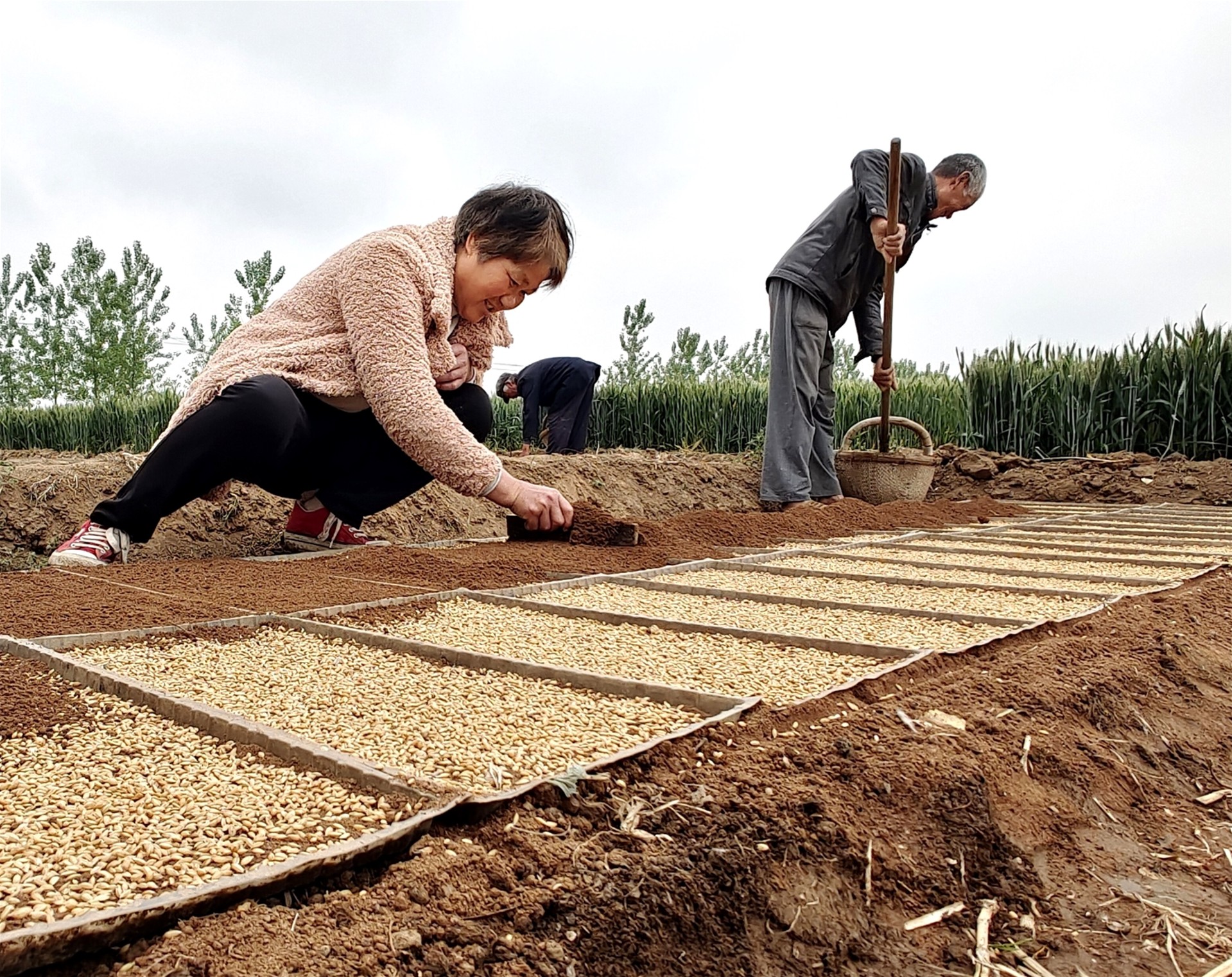 5月11日,郯城县马头镇高册村农民正在地头下稻种育秧苗,到处呈现出一派繁忙景象。