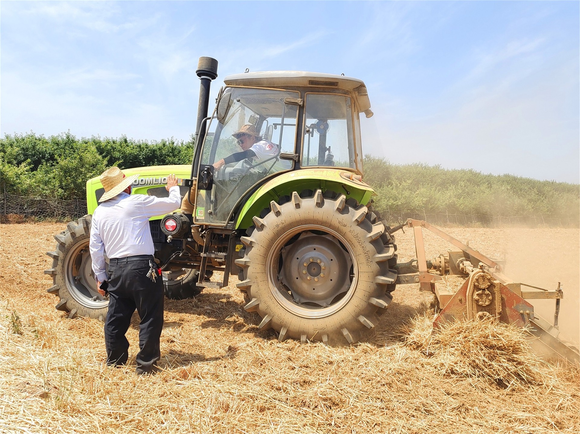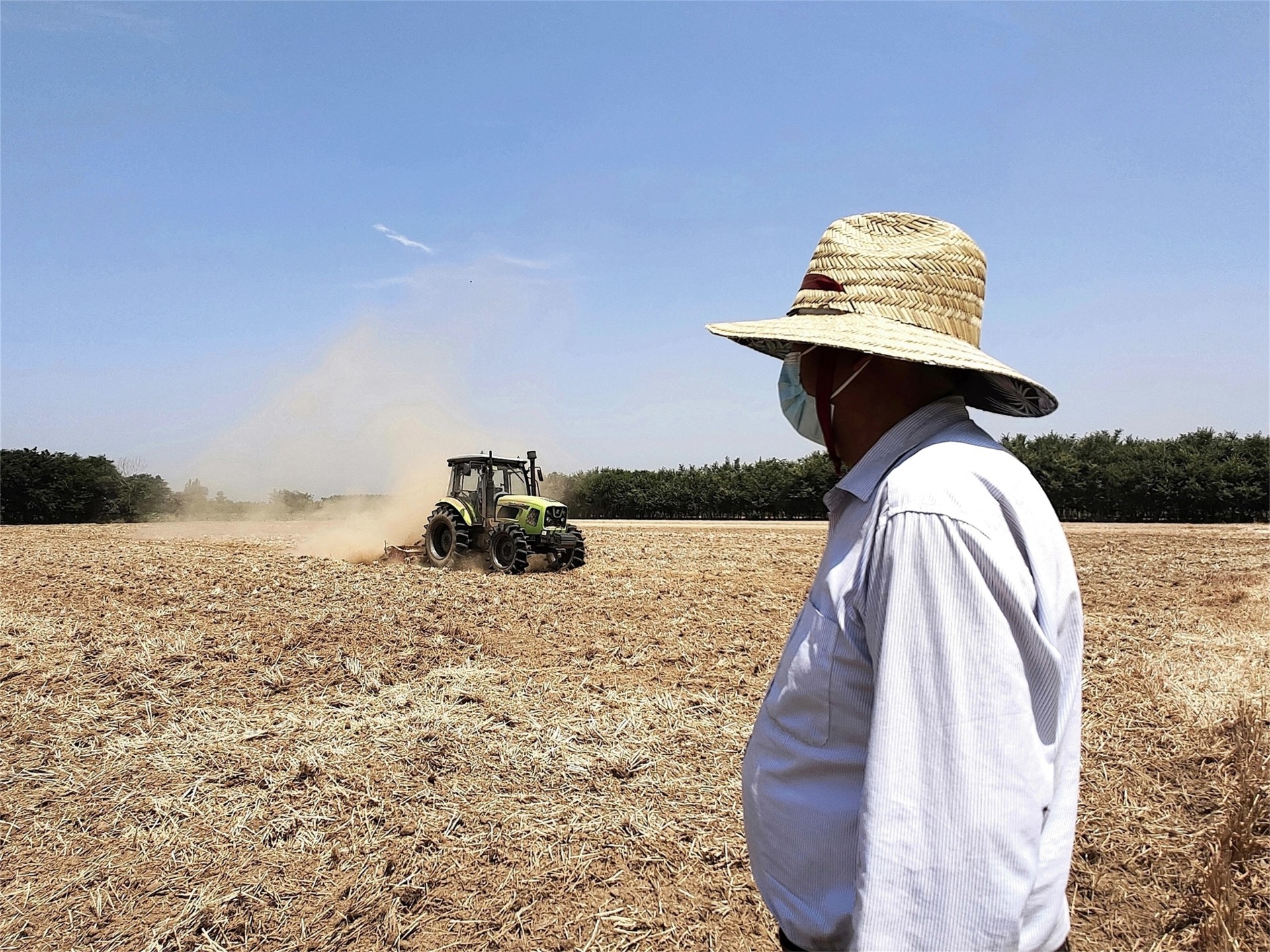 6月1日,一台大马力拖拉机正在郯城县马头镇郁顶村湖片耕耙刚刚收割完的麦地。至此,郯城县秸秆还田灭茬农机1+1模式在马头镇普遍落实。