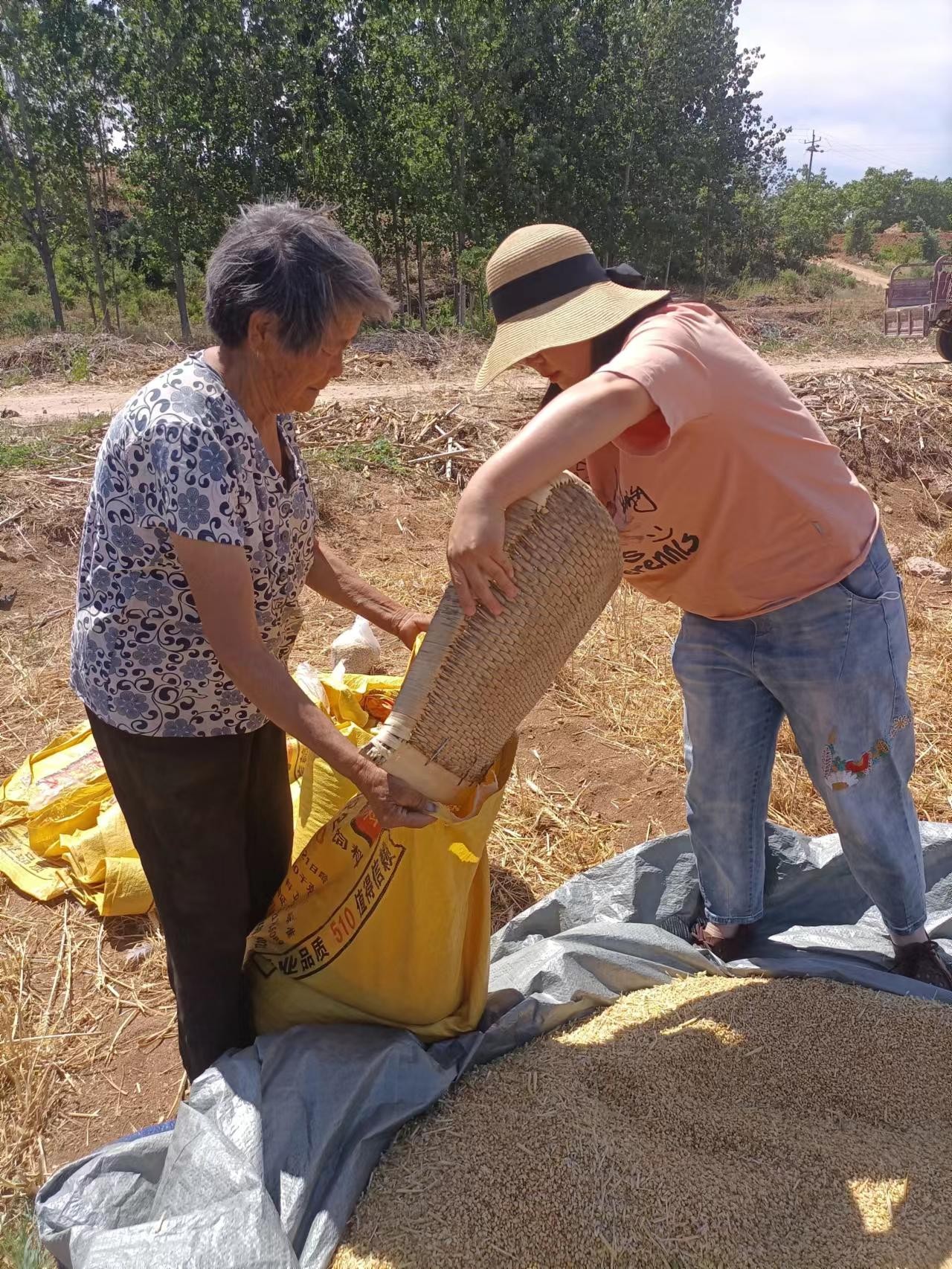 蒙阴县妇联派驻张宝河村的第一书记杨虹,最近将办公地点转移到了麦田里,一是宣传秸秆禁烧、秸秆还田;二是为缺少人手的乡亲搭把手,助力麦收,让他们少着点儿急。村民张玉江老两口一大早就来到自家地头等着收割机来收割小麦,他们的儿子出国务工,家里缺少劳动力,杨虹和村干部了解情况后,提前联系了收割机,连割带打半个小时他家的半亩小麦就全部颗粒归仓。
