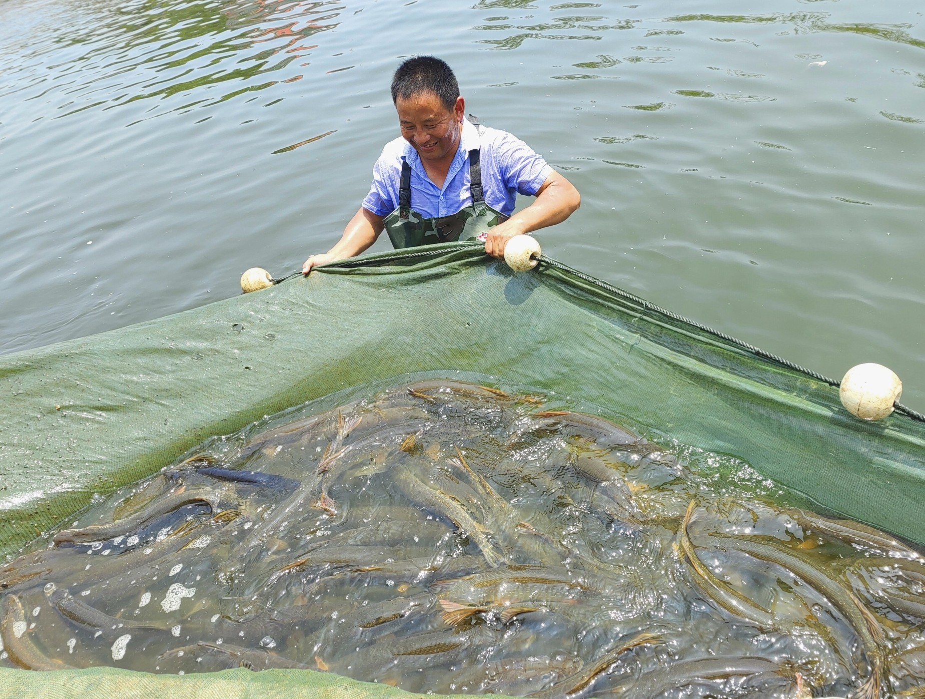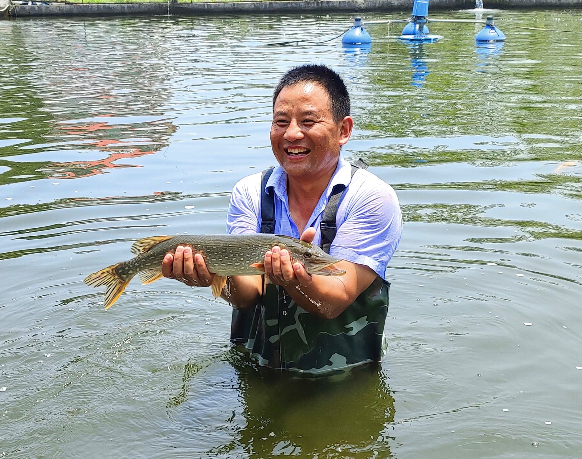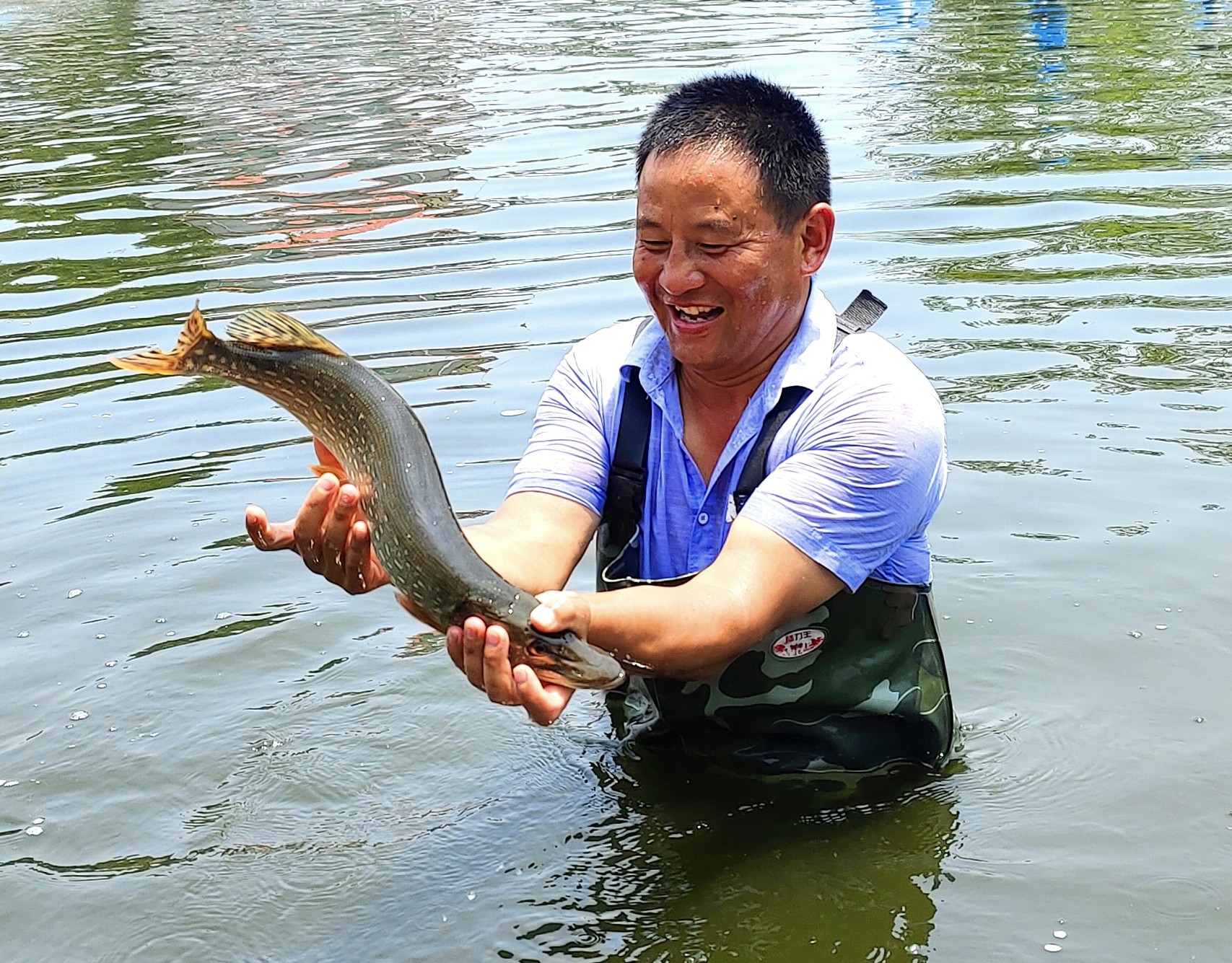 6月20日,郯城县鱼胖胖养殖农民合作社捕获白斑狗鱼。社长倪长征看着捕获满网的凶猛“怪兽”,脸上露出丰收的喜悦。