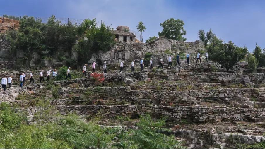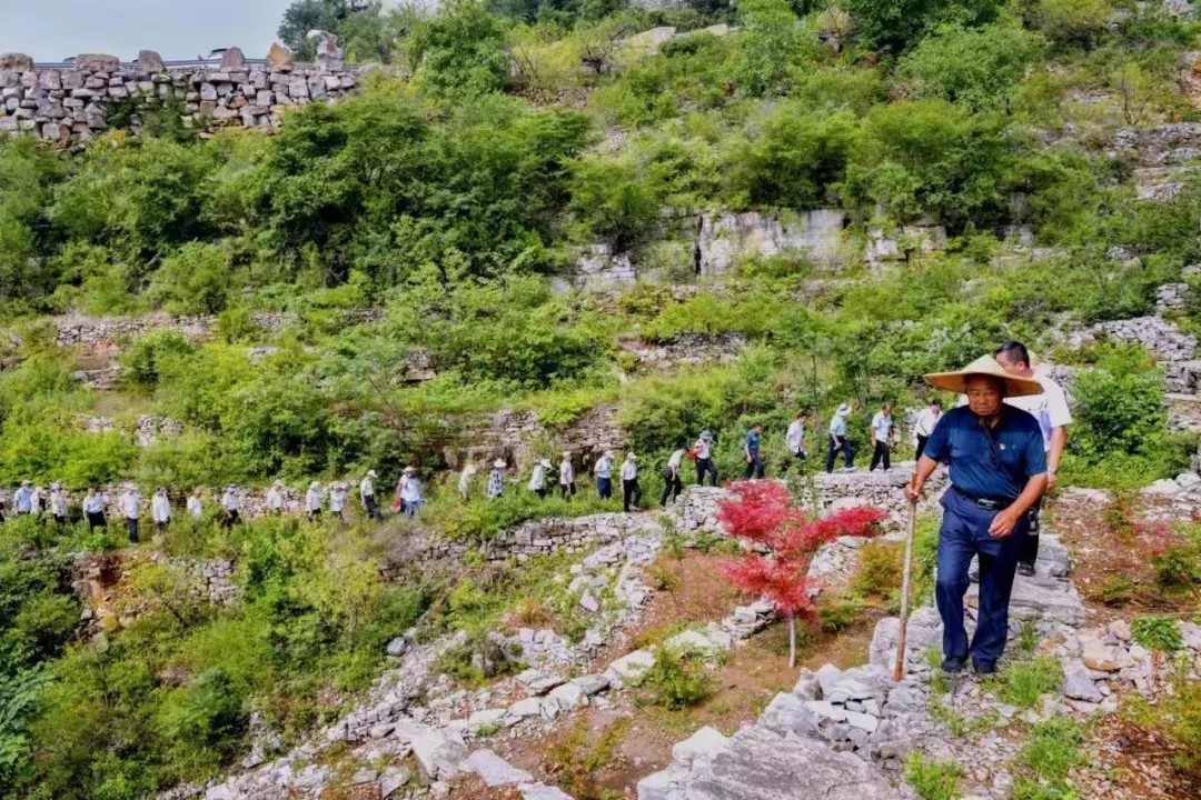 会后,所有党员在刘嘉坤的带领下,冒着盛夏酷暑,沿着崎岖的山路,翻山越岭,用了五个小时的时间,坚持步行10多公里,实际观摩“九弯十八园”,边走边听取了详细讲解。据了解,所谓“九弯十八园”就是在九间棚悬崖之上建了20华里的18个园林,包括桃园、杏园、梨园、金银花园、百果园、百草园等等。