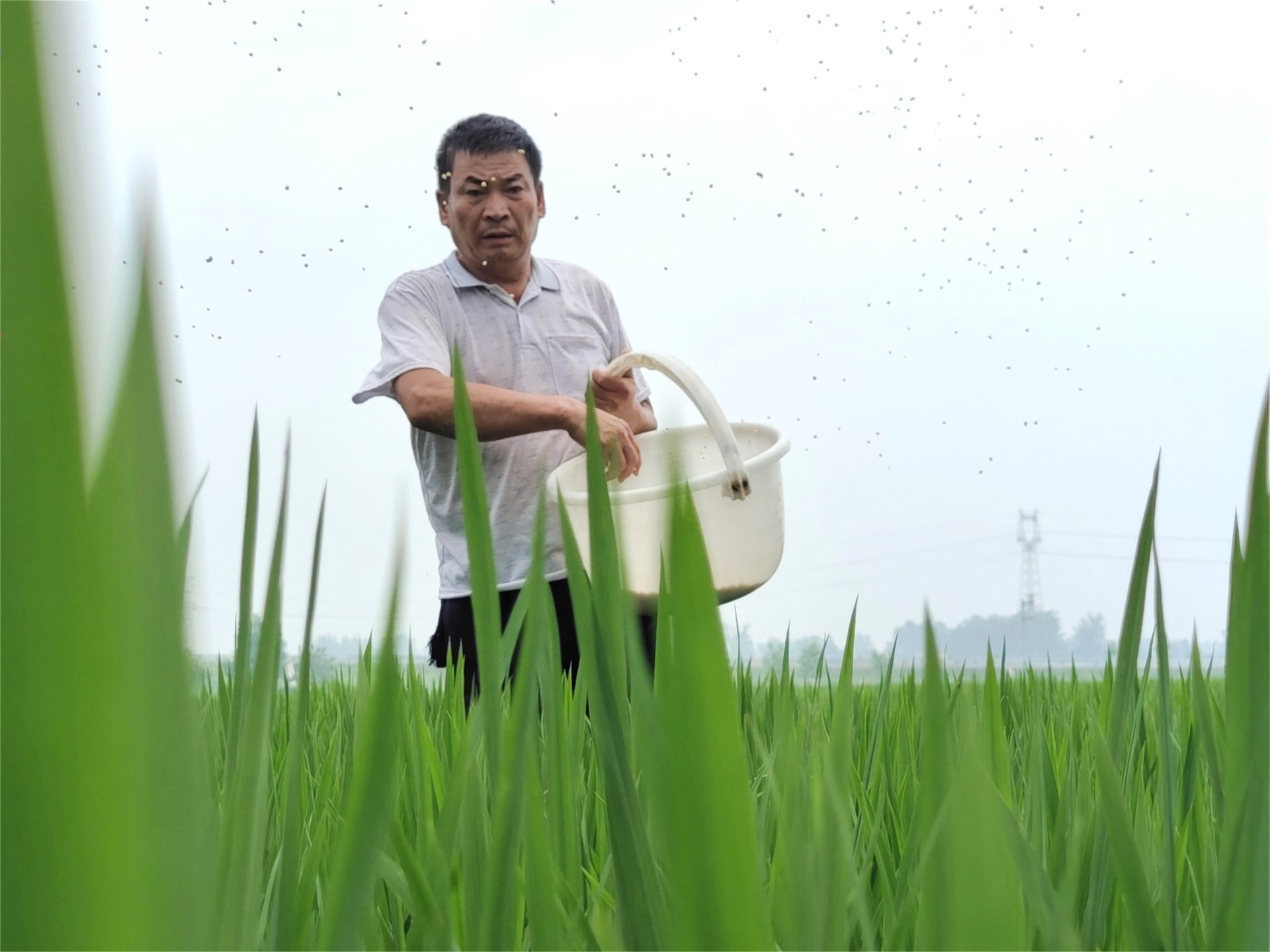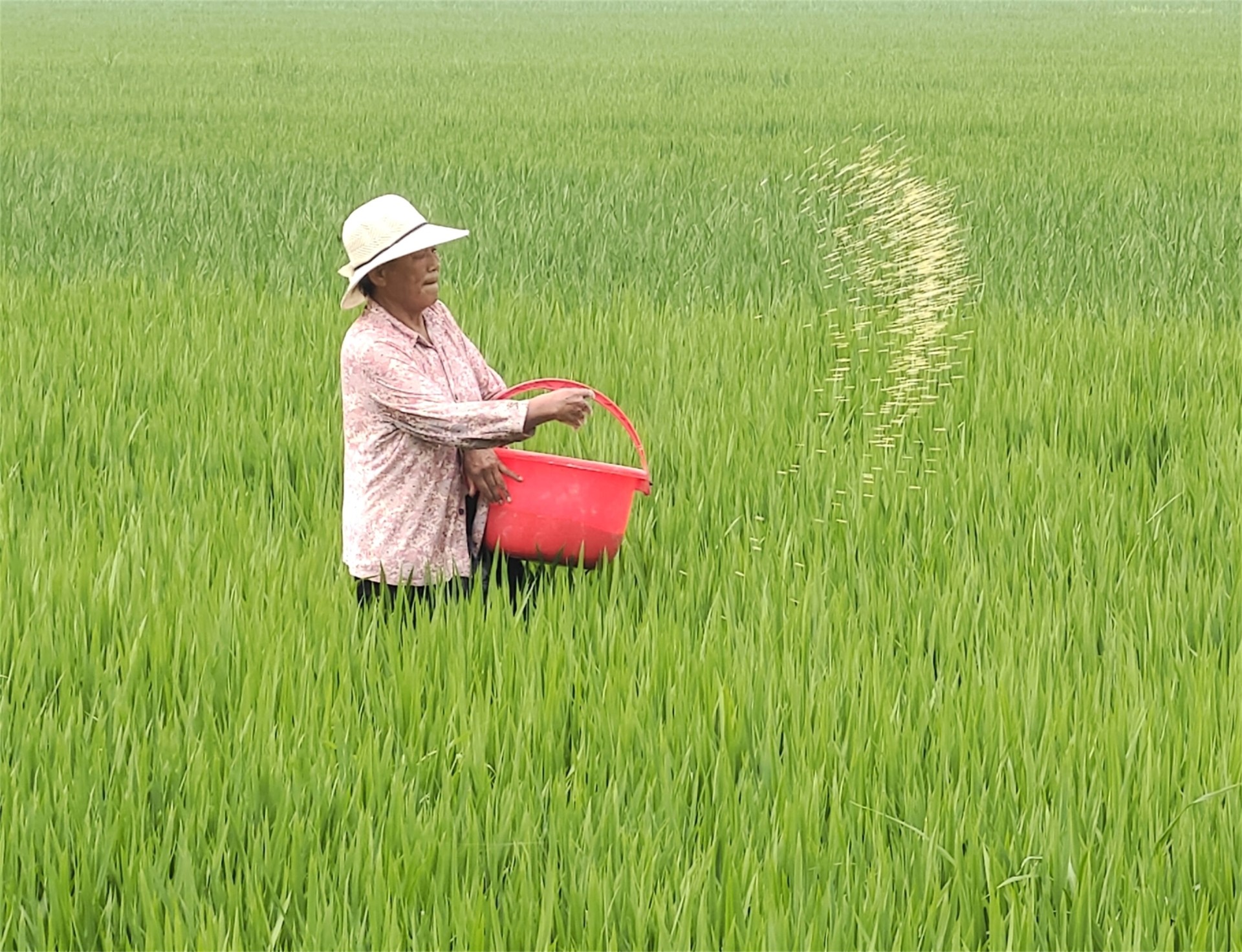 7月21日,郯城县马头镇王店子村民在加强水稻田间管理。昨日暴雨过后,农民们抓住有利机会对返青水稻秧进行施肥,确保秋季农作物丰产丰收。