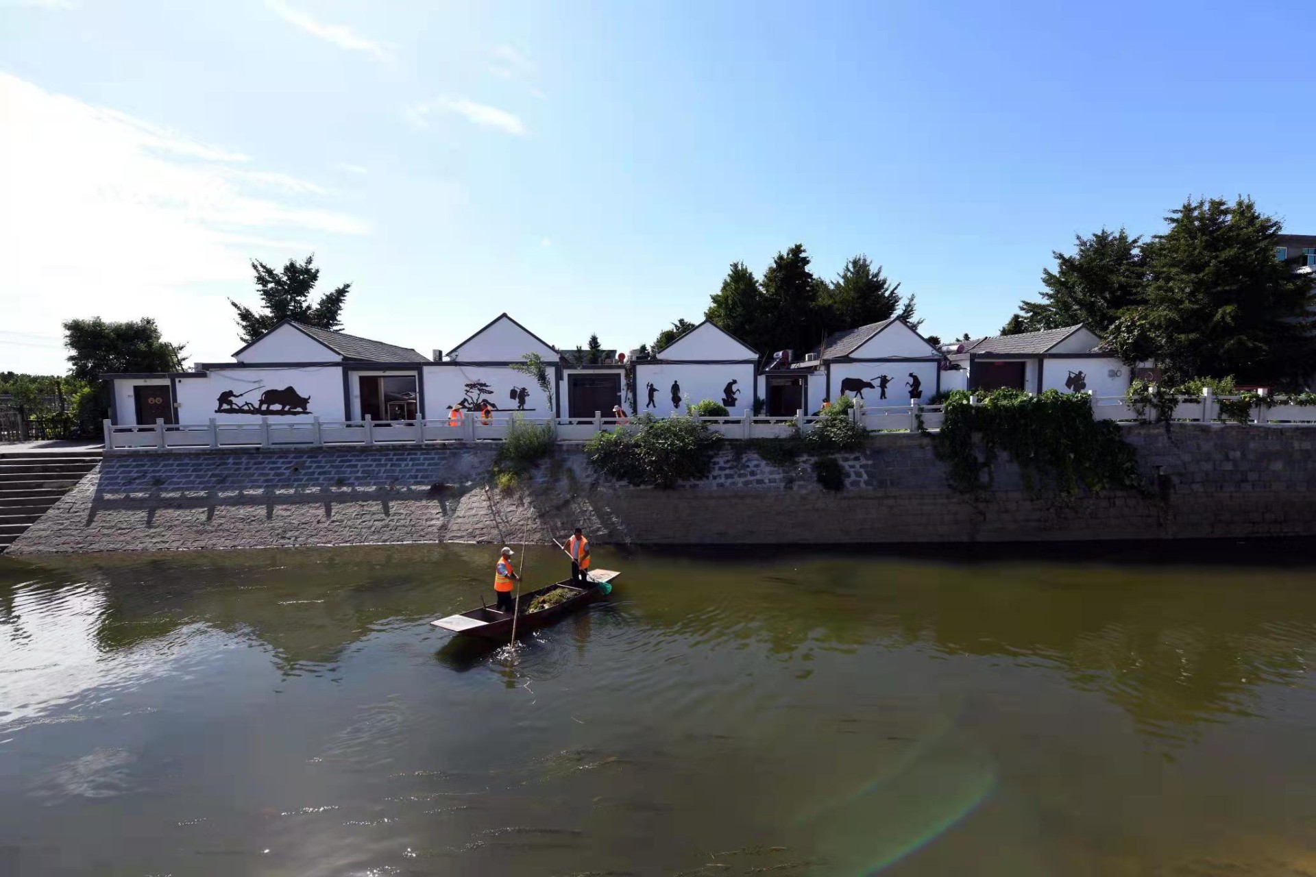 8月23日,在山东省临沂市郯城县马头镇南新庄,两名环卫工人在“五彩墙画”旁的河沟里打捞漂浮物。