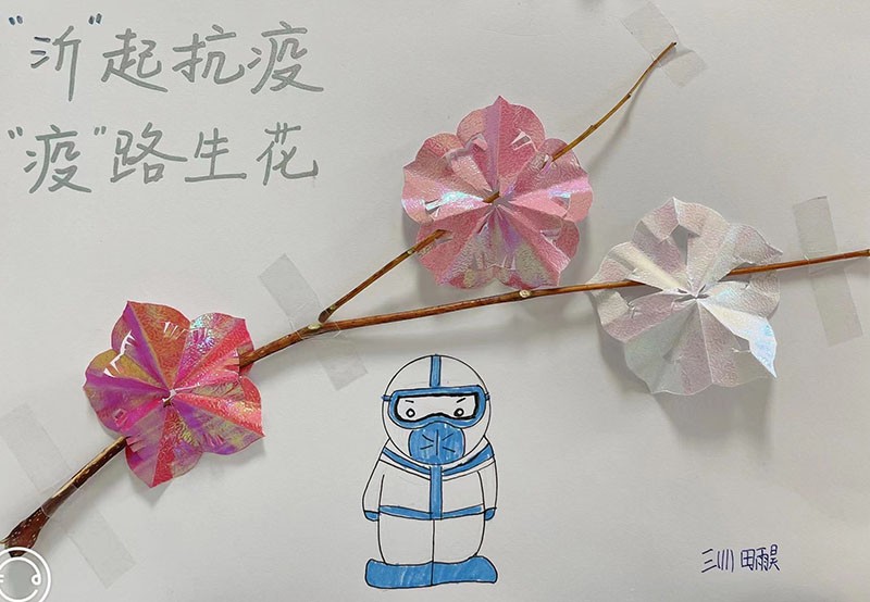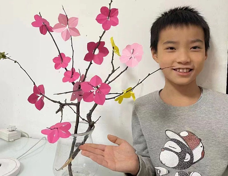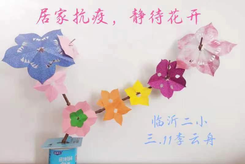 全班师生通过在线课堂了解非遗传承人苗苗,并欣赏了她的非遗剪纸作品。随后,她带领学生和家长体验剪纸的快乐,通过折纸、剪五角星、折成桃花、装饰作品等步骤,学习折剪并粘贴成一枝枝五颜六色的繁花作品。