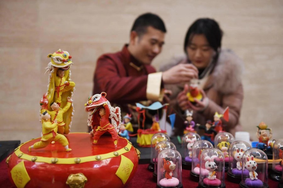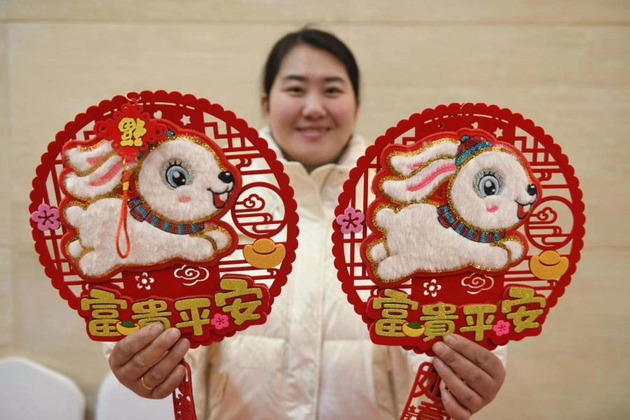 1月14日,在山东省临沂市郯城县大剧院,民间艺人展示省级“非遗”中国结《玉兔报平安》。