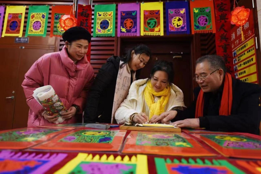 1月14日,在山东省临沂市郯城县大剧院,民间艺人张乃苍(右一)向市民传授省级“非遗”挂门笺的制作方法。