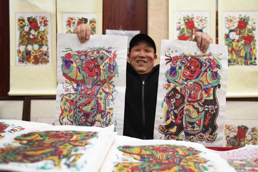 1月14日,在山东省临沂市郯城县大剧院,民间艺人展示省级“非遗”郯城木版年画。