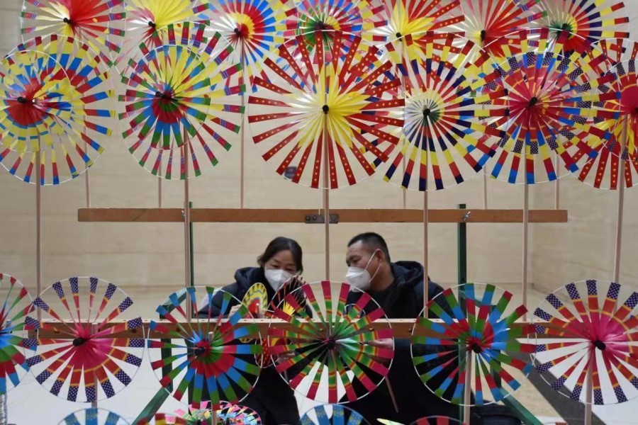 1月14日,在山东省临沂市郯城县大剧院,市民(左)在体验市级“非遗”平邑风车的制作方法。