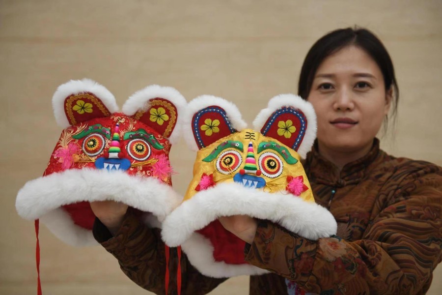 1月14日,在山东省临沂市郯城县大剧院,民间艺人展示市级“非遗”费县手绣《虎头帽》。