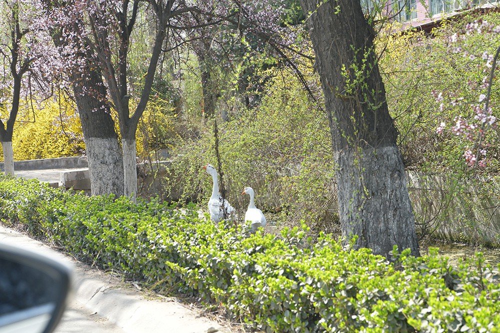 阳春三月,平邑县铜石镇的紫叶李、红梅、连翘等竞相绽放,村口的大鹅迎着春风漫步在花海中,在勃勃生机中一副祥和、温暖的画卷悄然展开。
