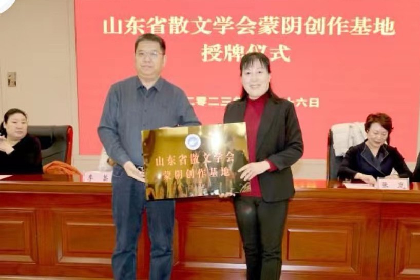 据王展介绍,山东省散文学会新一届理事会授牌成立蒙阴创作基地,集聚全会资源助力乡村文化振兴,书写当代沂蒙华章,将全力支蒙阴作协启动全省首个齐鲁散文之乡创建,用文学智慧,美文名篇提升蒙阴影响力、美誉度,在全省将蒙阴作为第一个齐鲁散文之乡创建单位。