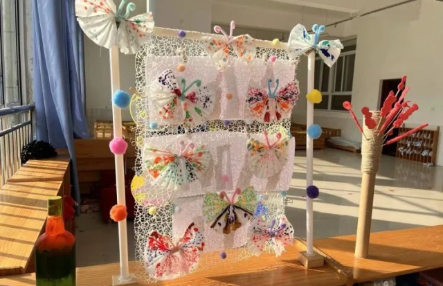 有的班级充分利用墙面、吊饰等立体的空间展示自己班的整体风格。有的班级充分利用各种废旧的材料,将作品活灵活现的展现在大家眼前。