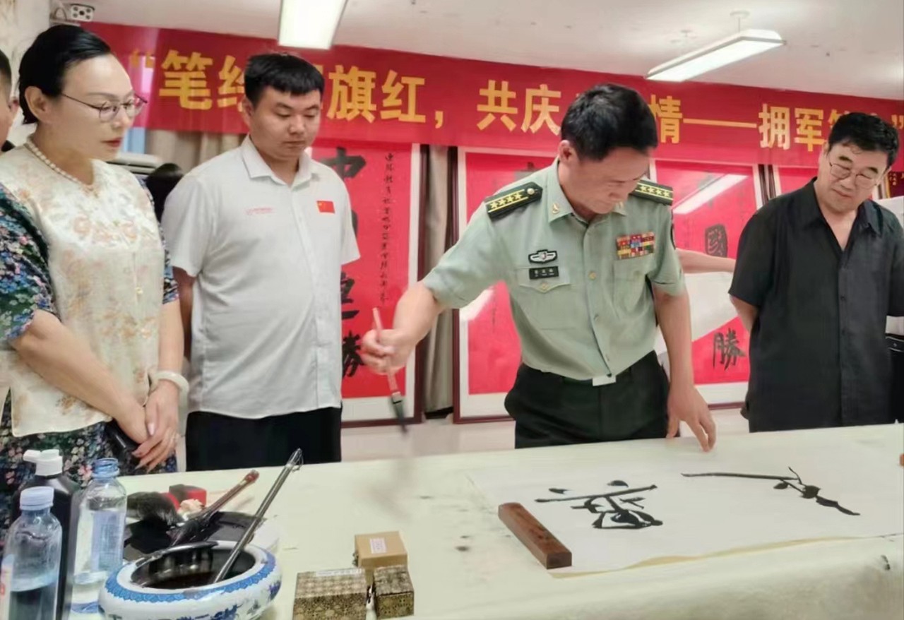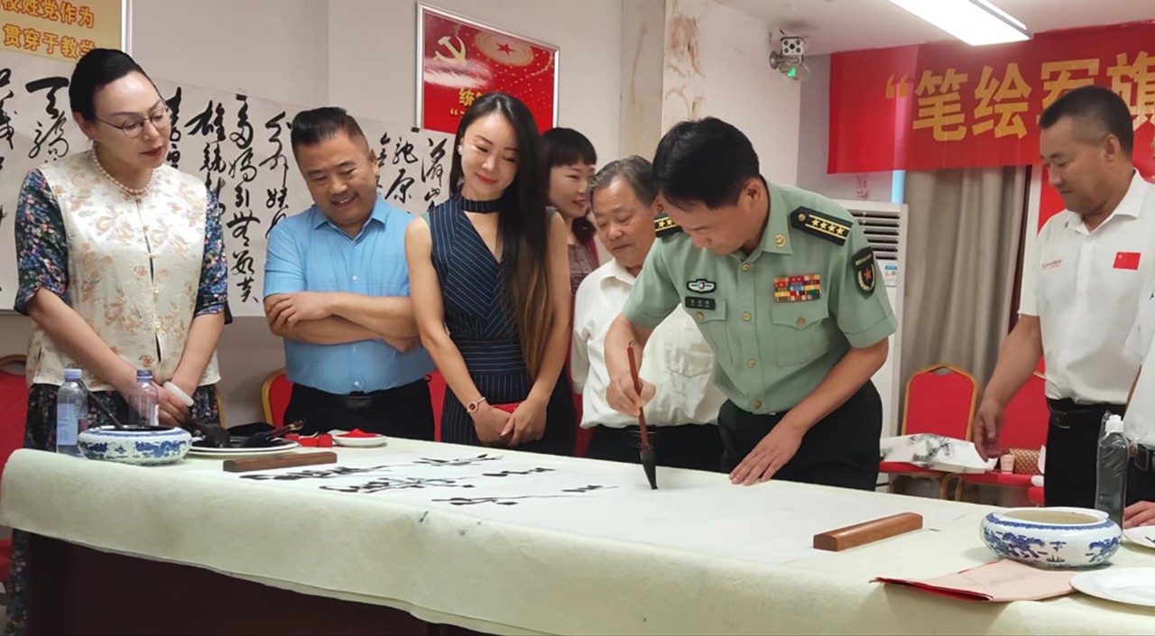 在笔会现场,临沂市委常委、临沂军分区大校政委胥成峰挥毫泼墨,用艺术热情表达了对文化拥军的赞扬和对“党群同心、军民情深、水乳交融、生死与共”沂蒙精神的弘扬。