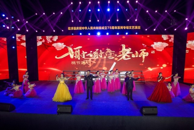 9 月 26 日晚 7 点 30 分,临沂市临沭县文化广场华彩四溢、热闹非凡,一场精彩纷呈的临沭县庆祝中华人民共和国成立75周年系列活动之教育系统专场晚会在这里启幕。此次晚会紧紧围绕“大力弘扬教育家精神,加快建设教育强国”这一核心主题,肩负起传承红色基因、激发广大党员干部群众爱党爱国热情与干事创业激情的重任,同时为群众的精神文化生活增添了浓墨重彩的一笔。