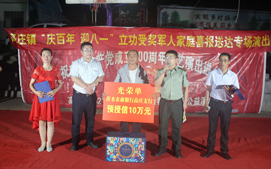 演出过程中,高庄镇党委委员、武装部长杨振伟和沂水农商银行高庄支行行长李勇共同为闫传坤的家属送上喜报和奖励金,现场授信“拥军贷”贷款额度10万元。“闫传坤真有出息!给老闫家争光了!”“这是镇里专门给他家组织的演出,真好”!现场群众纷纷称赞,向立功军人家属表示祝贺。