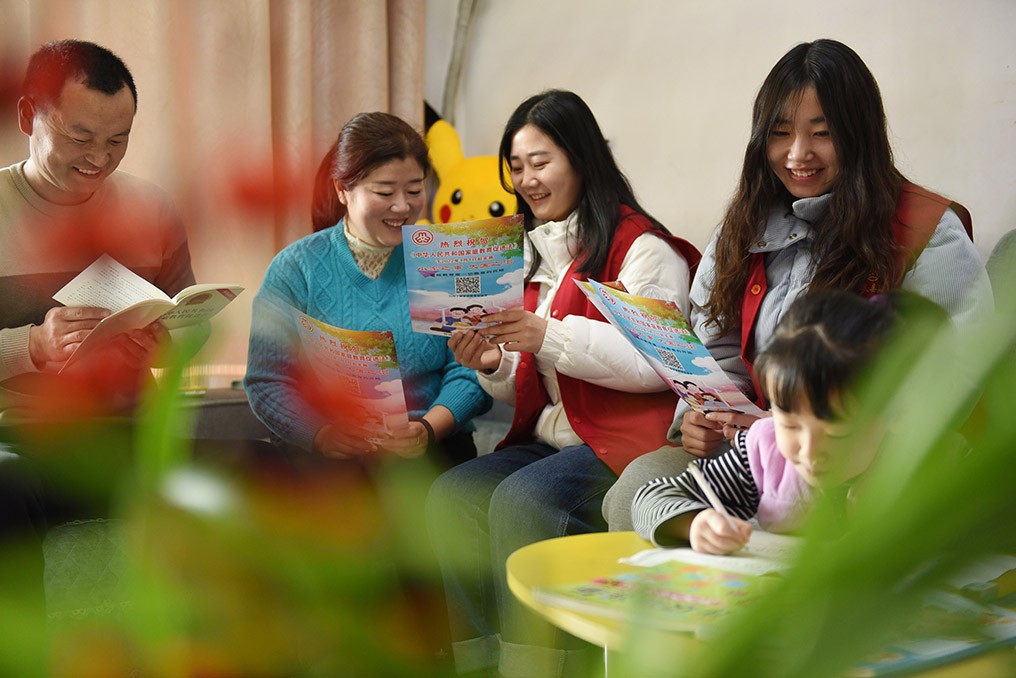 2022年1月1日,山东省临沂市郯城县巾帼普法志愿者为马头镇玉带社区高江涛(左一)送来了普法书籍,并向他们宣讲《中华人民共和国家庭教育促进法》。