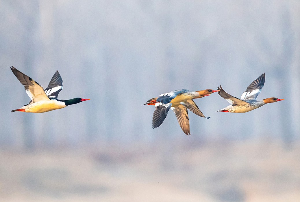 2022年1月3日,在沂河山东省临沂市郯城县马头段,几只中华秋沙鸭在空中飞舞。