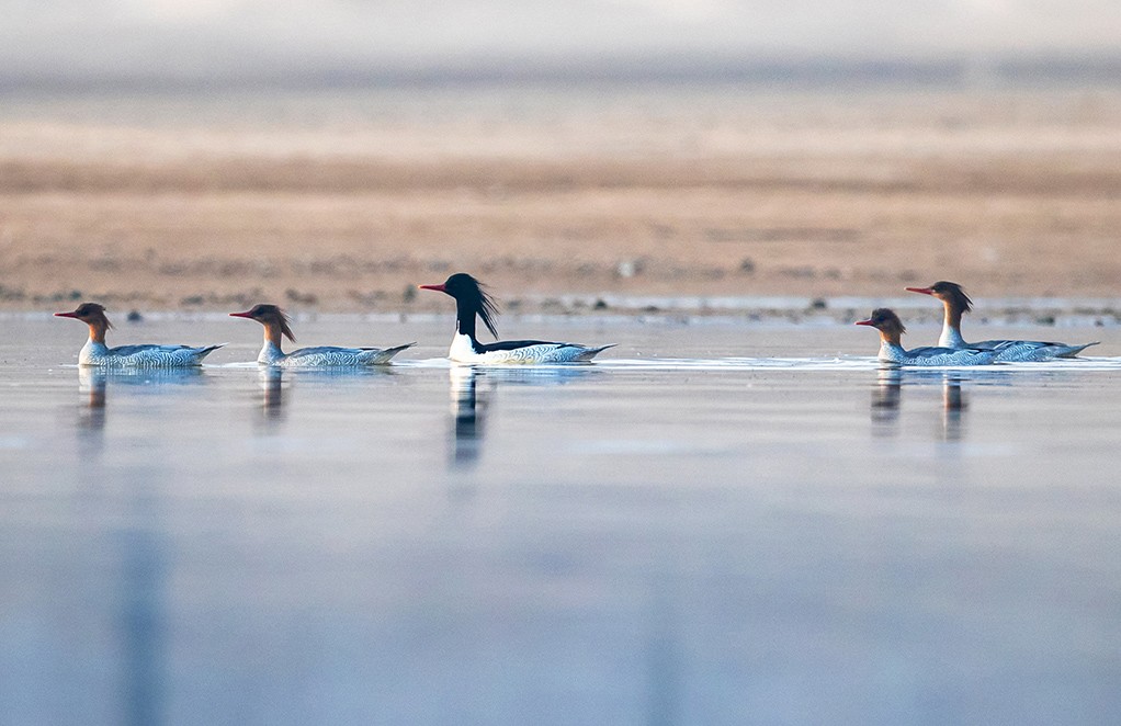 近日,10多只中华秋沙鸭飞抵沂河山东省临沂市郯城县段越冬,引来众多鸟类爱好者围观。据了解,中华秋沙鸭俗名鳞胁秋沙鸭,有“水中大熊猫”“鸟类活化石”之称,它是中国特有鸟类,已经在地球上生存了7000万年,属于国家一级保护动物。目前在全球都不足6000只,被列入国际濒危物种红皮书、国际鸟类保护委员会濒危鸟类名录。临沂市郯城县生态环境优美,水质洁净,鱼虾和水生昆虫丰富,非常适宜中华秋沙鸭捕食及栖息。(房德华 刘宗武)