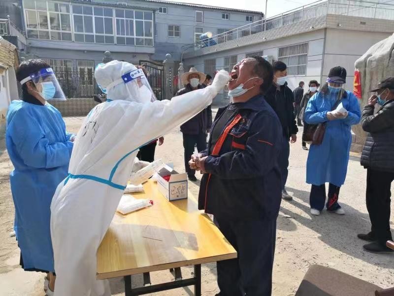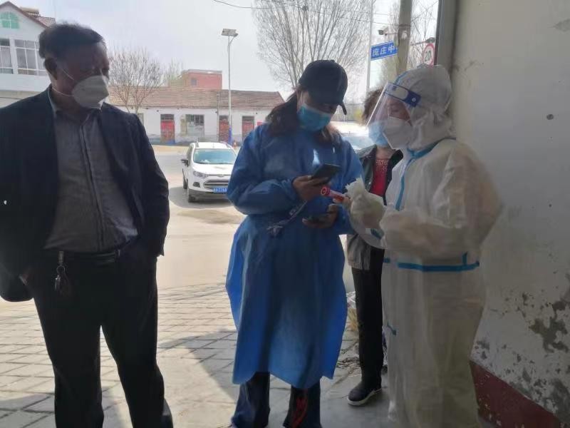 次日,按照分工,全镇分41个工作组对76个自然村所有在家人员进行第一轮的全员核酸检测。每组四人,一名医务人员,一名教师志愿者,两名机关人员。都各自为战,认真负责,加班加点,午饭都顾不上吃。医务人员张讷穿着隔离服,热的累得满面大汗,一天一口水都没喝上。时间紧,任务重,她认真工作,一丝不苟,严格按照操作规范给村民咽拭子核酸检测,不怕脏,不怕累。有的孩子鼻涕流入嘴里,她耐心用卫生纸擦去;有的老人口含痰,她耐心让老人到垃圾桶吐了,并帮着老人用卫生纸擦干净后再做,确保检测准确无误。她从不埋怨老人。从早上9点,一直干到下午5点。等她脱去隔离服,站了一天的她,累得站立不稳。问她累不累,她强笑着说道,“不累不累,我的手就是有点麻了,孩子光打催促电话,都打三次了,叫赶紧回家。”