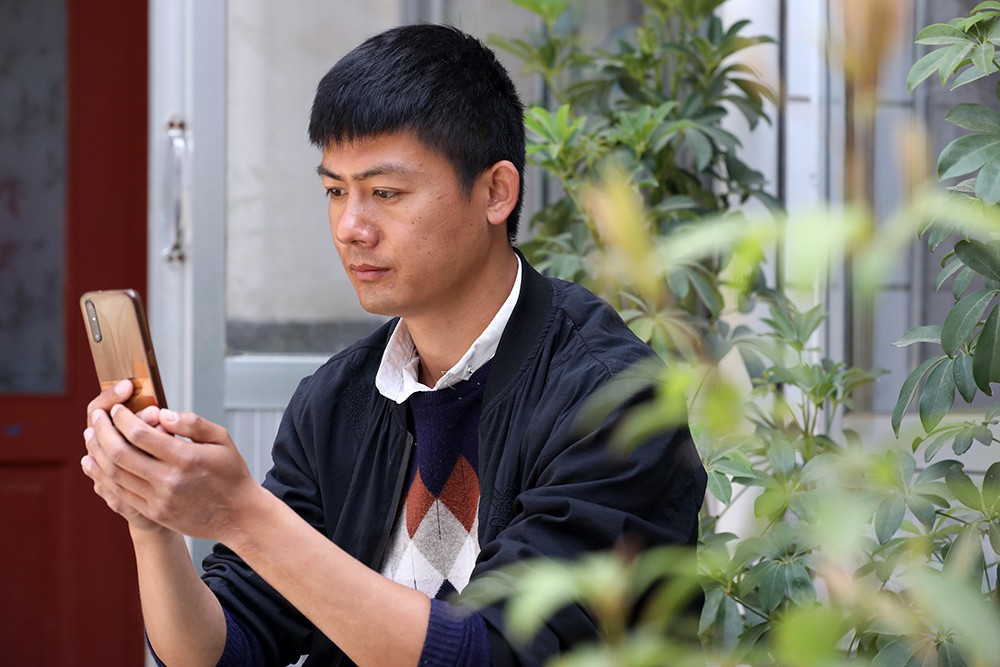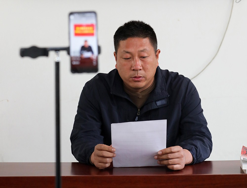 4月16日,山东省临沂市郯城县庙山镇陈邵村党员邵明志正在家中观看村党支部直播。