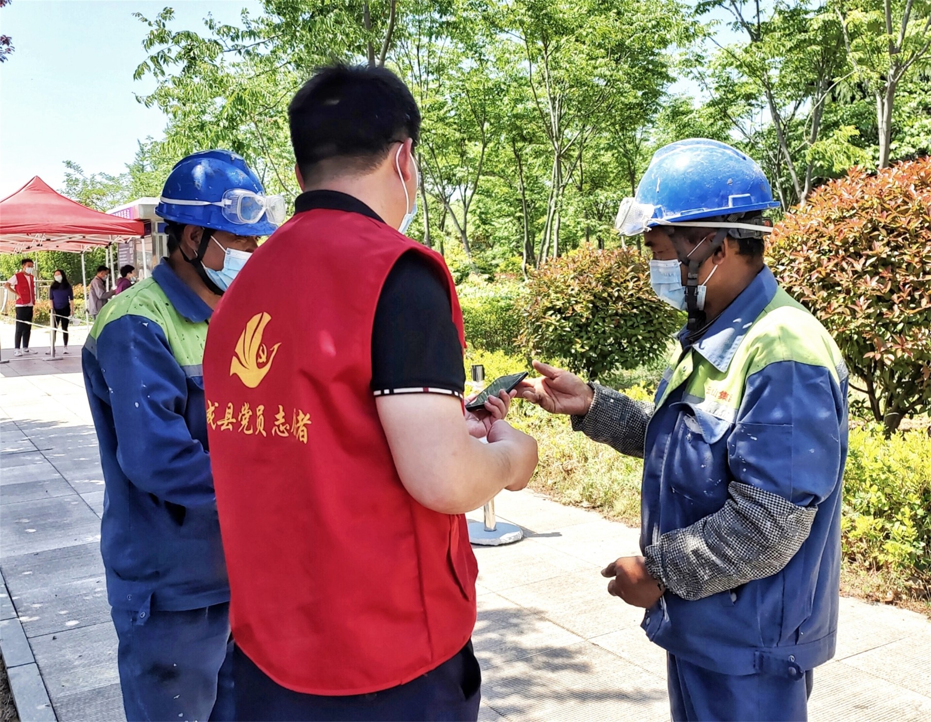 5月4日,郯城县党员志愿者正在该县经济开发区核酸检测地点为前来检测的员工下载扫码程序。