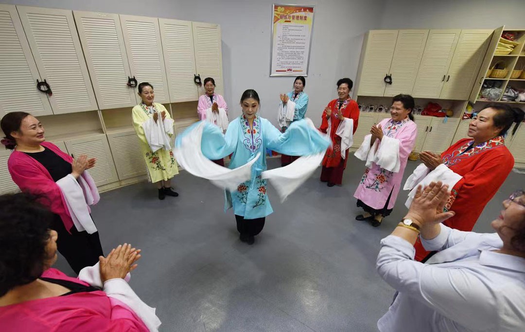 6月11日,在山东省临沂市郯城县文化馆“戏曲班”上,民间艺人张开红(中)向学员们传授国家级“非遗”柳琴戏的表演方法。
