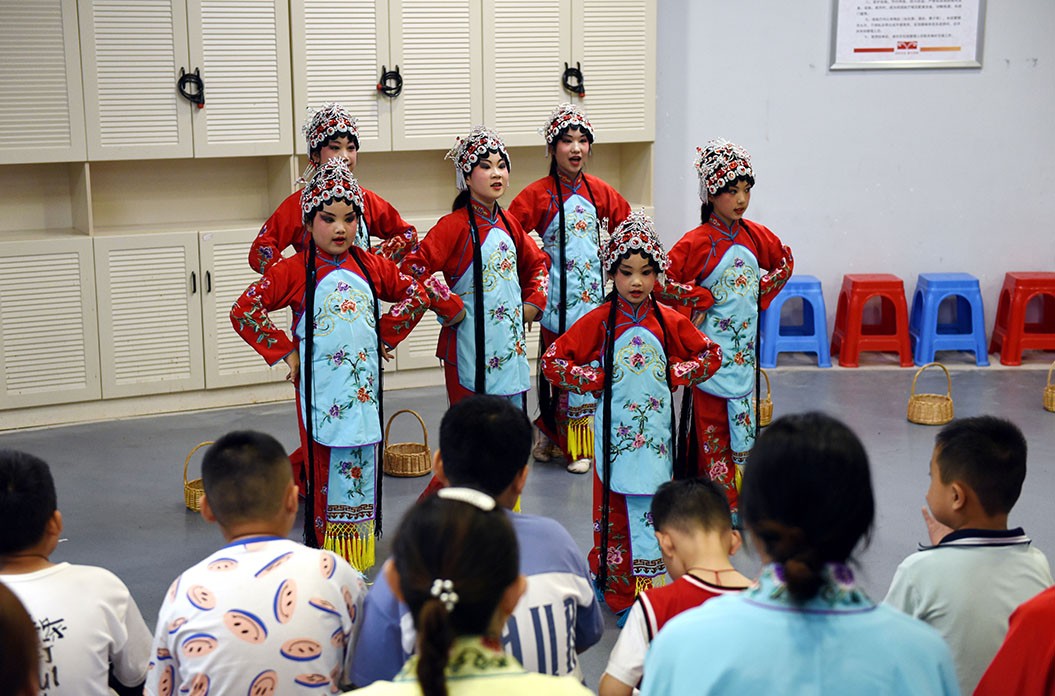 6月11日,在山东省临沂市郯城县文化馆“戏曲班”上,小演员给学员们表演国家级“非遗”柳琴戏。