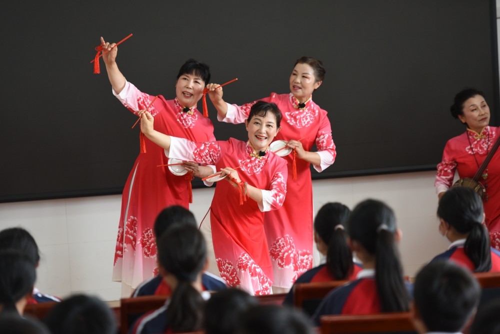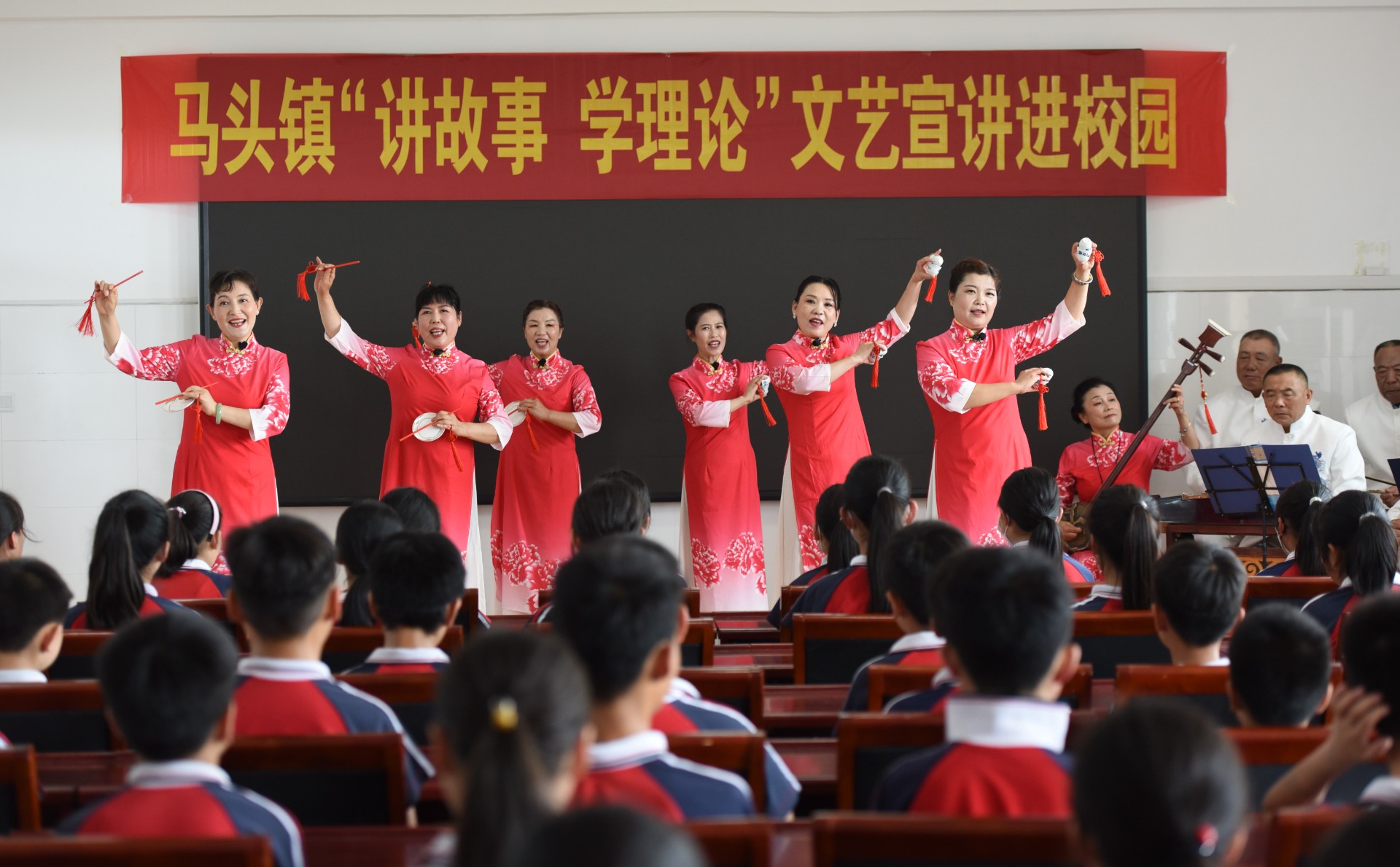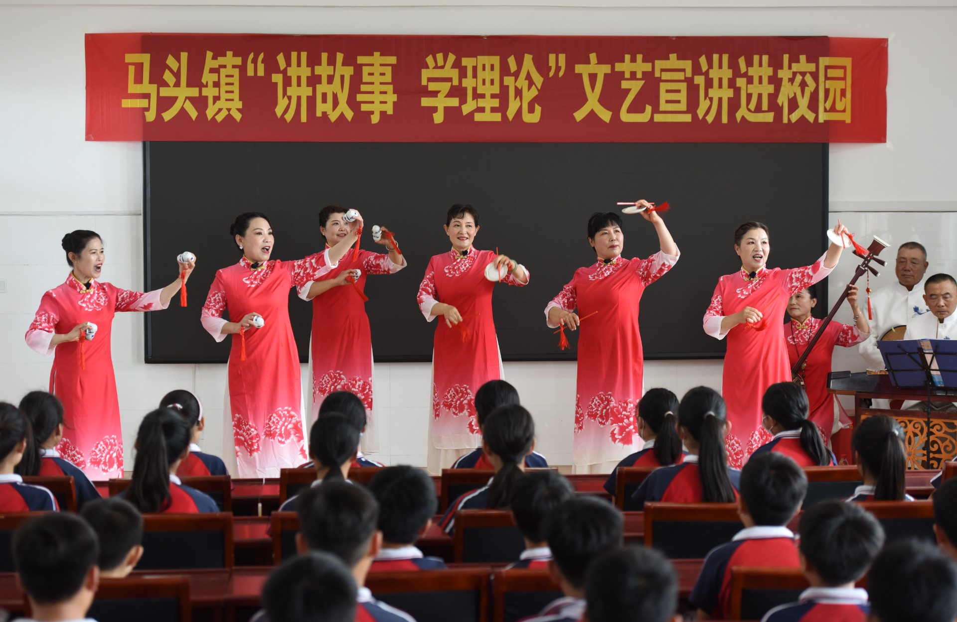 当日,山东省临沂市郯城县马头镇“讲故事 学理论”文艺宣讲队走进罗荣桓红军小学,民间艺人用国家级非遗《鲁南五大调》的说唱形式为老师和学生宣讲习近平新时代中国特色社会主义思想。据悉,“讲故事 学理论”文艺宣讲队还将走进村街、企业、社区、校园宣讲演出,讲好党的故事、传唱红色经典。
