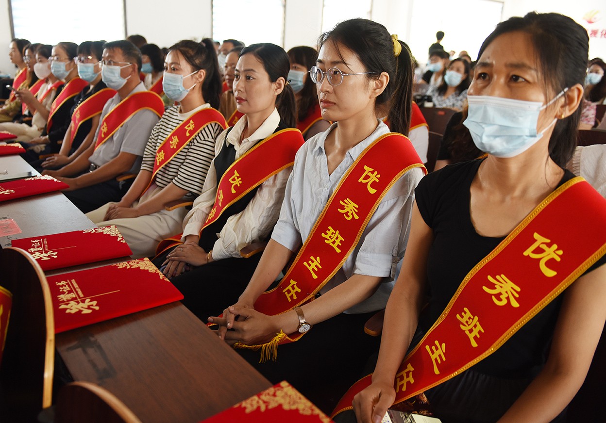 9月10日,山东省临沂市郯城县马头镇受表彰的优秀教师在颁奖典礼上。