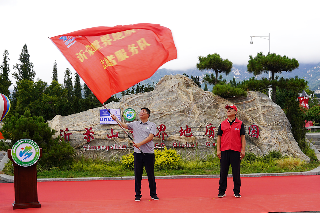 沂蒙山世界地质公园管理局党组书记、局长主玉向科普志愿服务队授旗