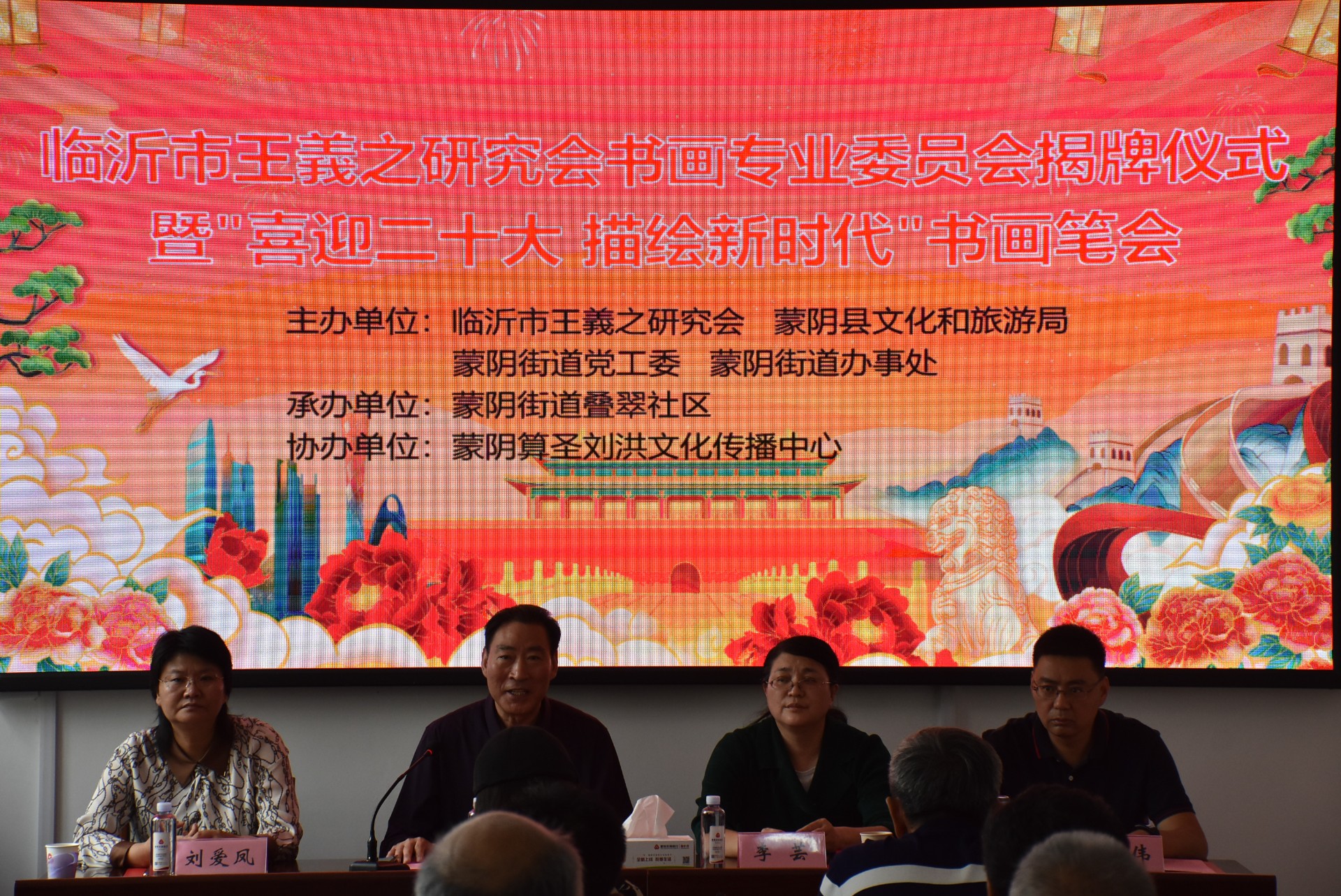 9月16日,由临沂市王羲之研究会、县文化和旅游局、蒙阴街道主办、蒙阴街道叠翠社区承办的临沂市王羲之研究会书画专业委员会揭牌仪式暨“喜迎二十大描绘新时代”书画笔会活动在叠翠社区举行,临沂市王羲之研究会会长、临沂大学教授周华、县政协副主席李芸和蒙阴街道党工委副书记、办事处主任刘爱凤参加。