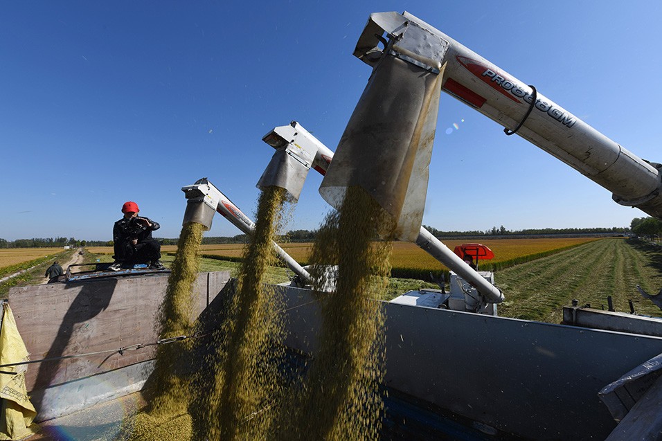 10月17日,在山东省临沂市郯城县马头镇大丰收家庭农场水稻种植基地,农机手驾驶收割机在田间作业。
