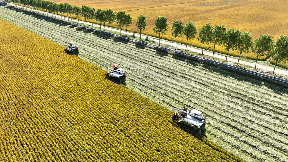 金秋时节,被誉为“鲁南粮仓”的山东省临沂市郯城县40余万亩水稻喜获丰收,农民抢抓农时收获晾晒,田间地头一派丰收的喜人景象。