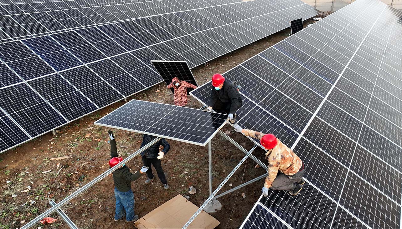 12月1日,在山东省临沂市郯城县马头镇采莲湖村,施工人员在安装光伏板。