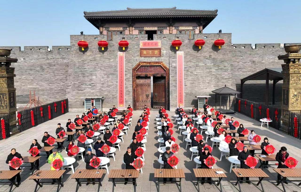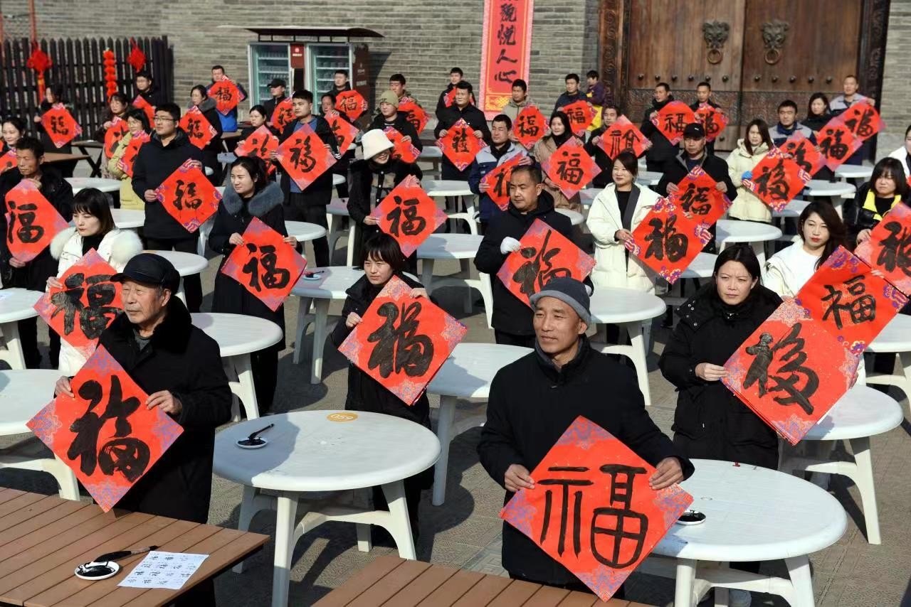 当日,山东省临沂市郯城县郯国古城景区举办“百人书福迎新春”送祝福活动,近百名书法爱好者同书“福”字,迎春贺岁,欢庆新年,祝福祖国繁荣昌盛、人民福庆有余。