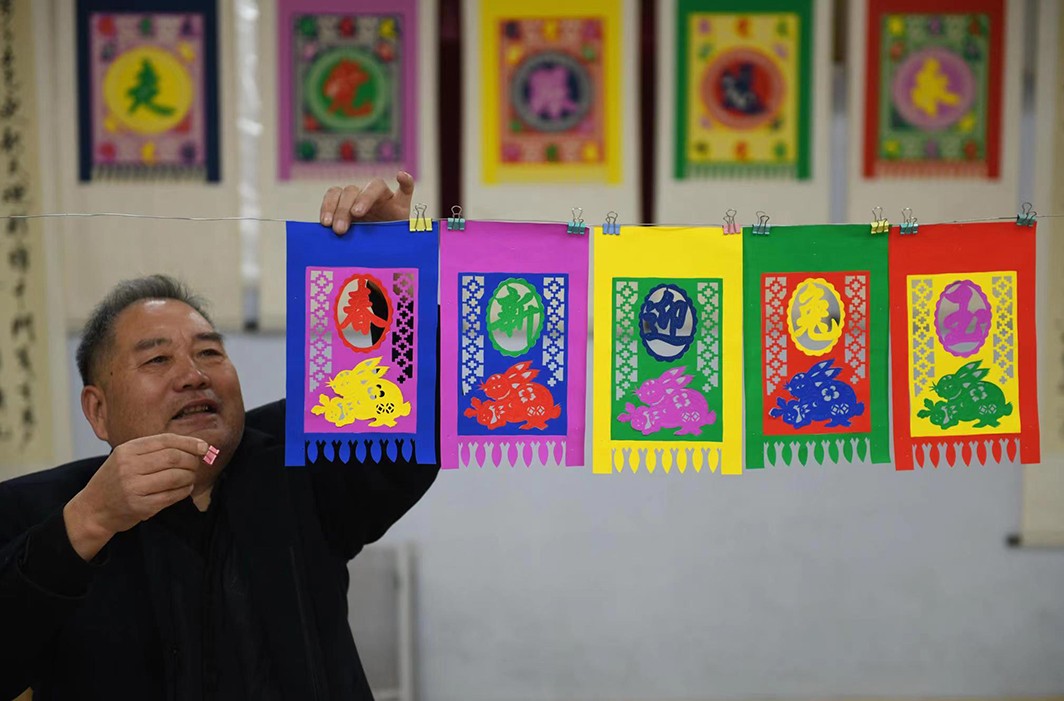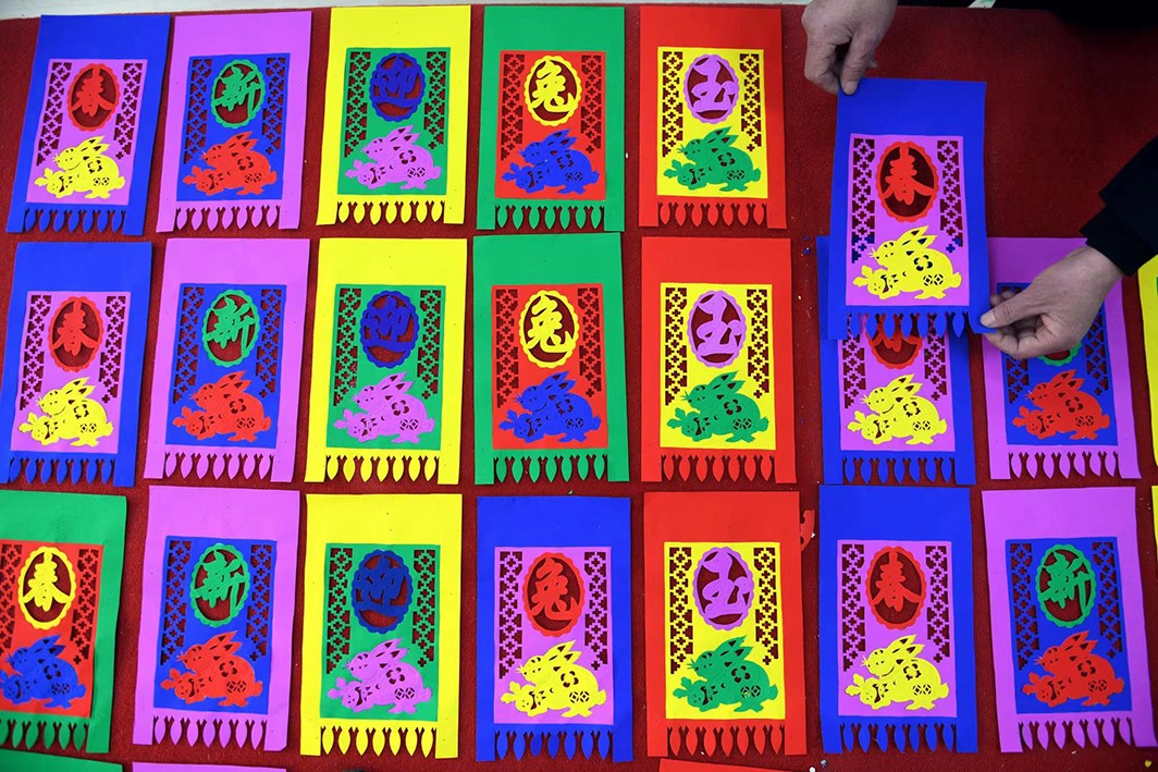 “兔年”春节将至,山东省临沂市郯城县马头镇农民制作“玉兔门笺”喜迎新春佳节。挂门笺属于民间刻纸,一般用彩纸剪刻而成,是春节期间装饰在门楣上的传统饰物,距今已有1500多年的历史,2006年被列入山东省非物质文化遗产保护名录。人们在除夕贴好挂门笺,一门五幅,用意是祝吉纳福,和春联、门画交相辉映,成为春节一道靓丽的风景线。