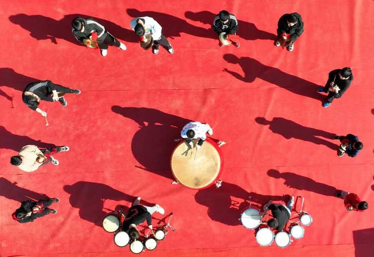 1月29日,在山东省临沂市郯城县郯国古城景区,参加迎新春锣鼓大赛的队员在进行比赛。