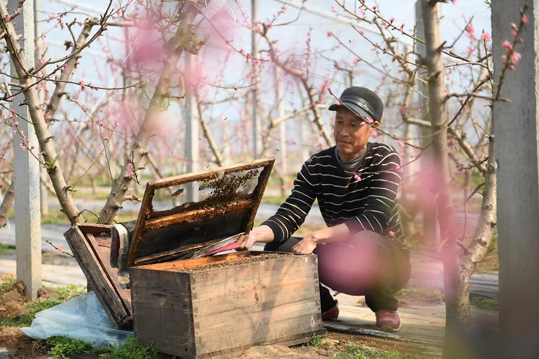 2月24日,山东省临沂市郯城县马头镇黄金殿村大棚油桃种植户李建泉在查看授粉的蜜蜂。