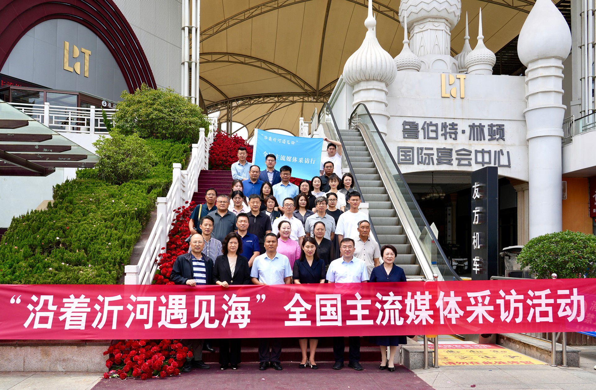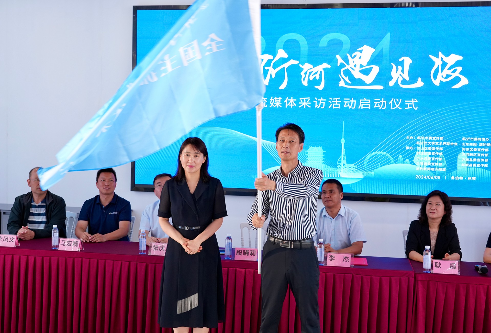 临沂市委宣传部副部长、市委网信办主任段晓莉为“沿着沂河遇见海”全国主流媒体采访活动授旗;山东商报总编辑李杰、 临沂市作家协会主席张岚分别致辞。