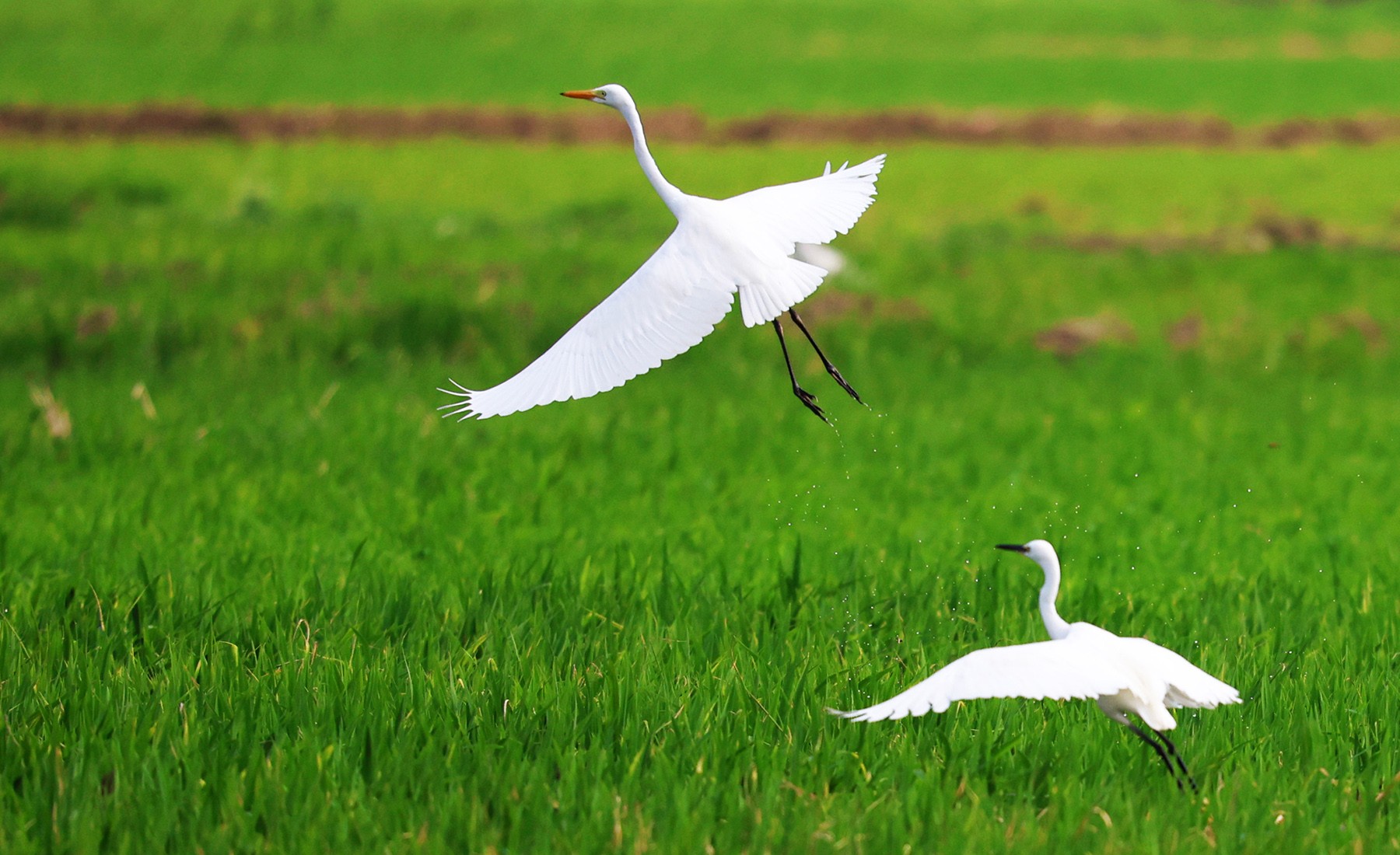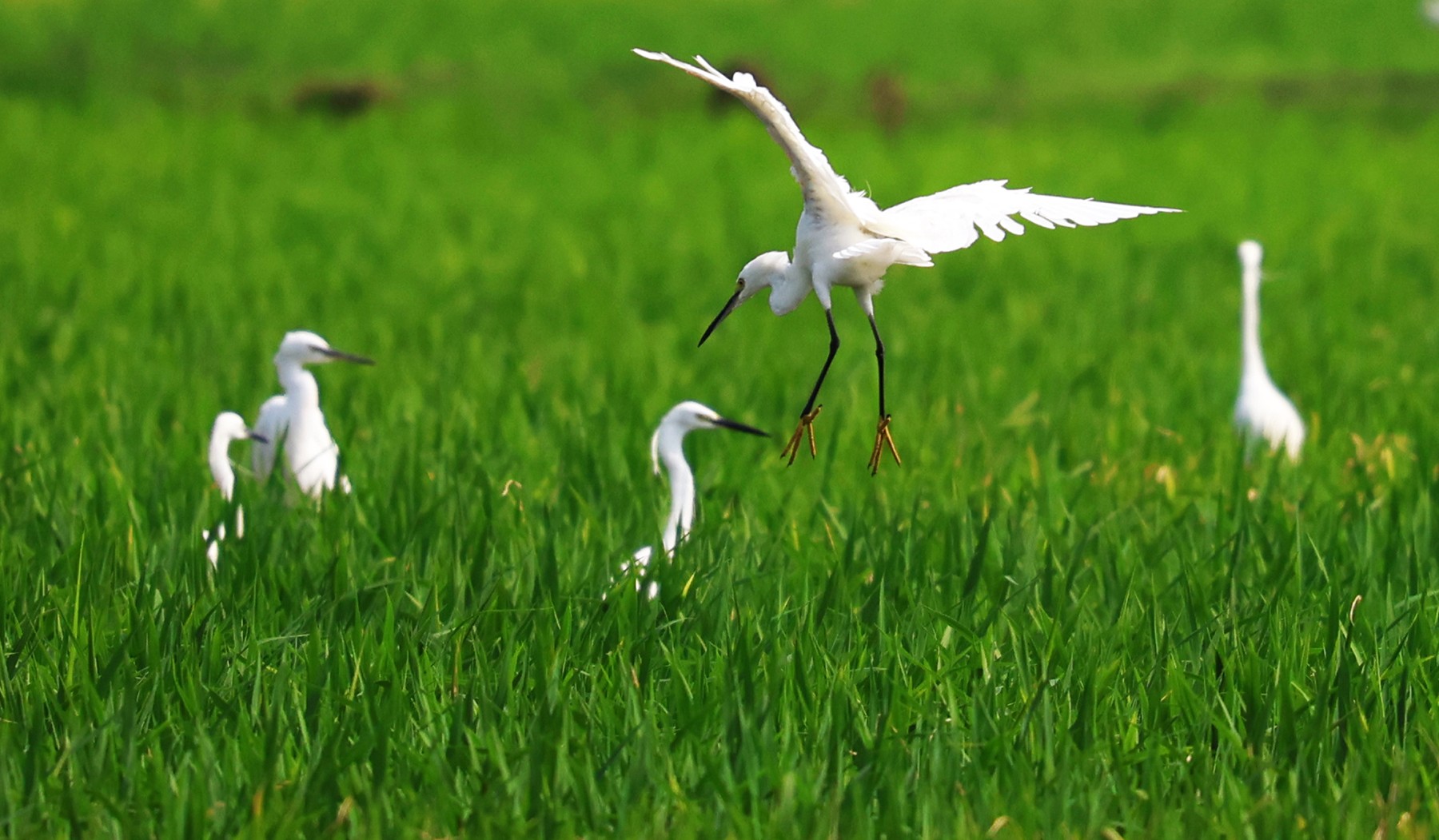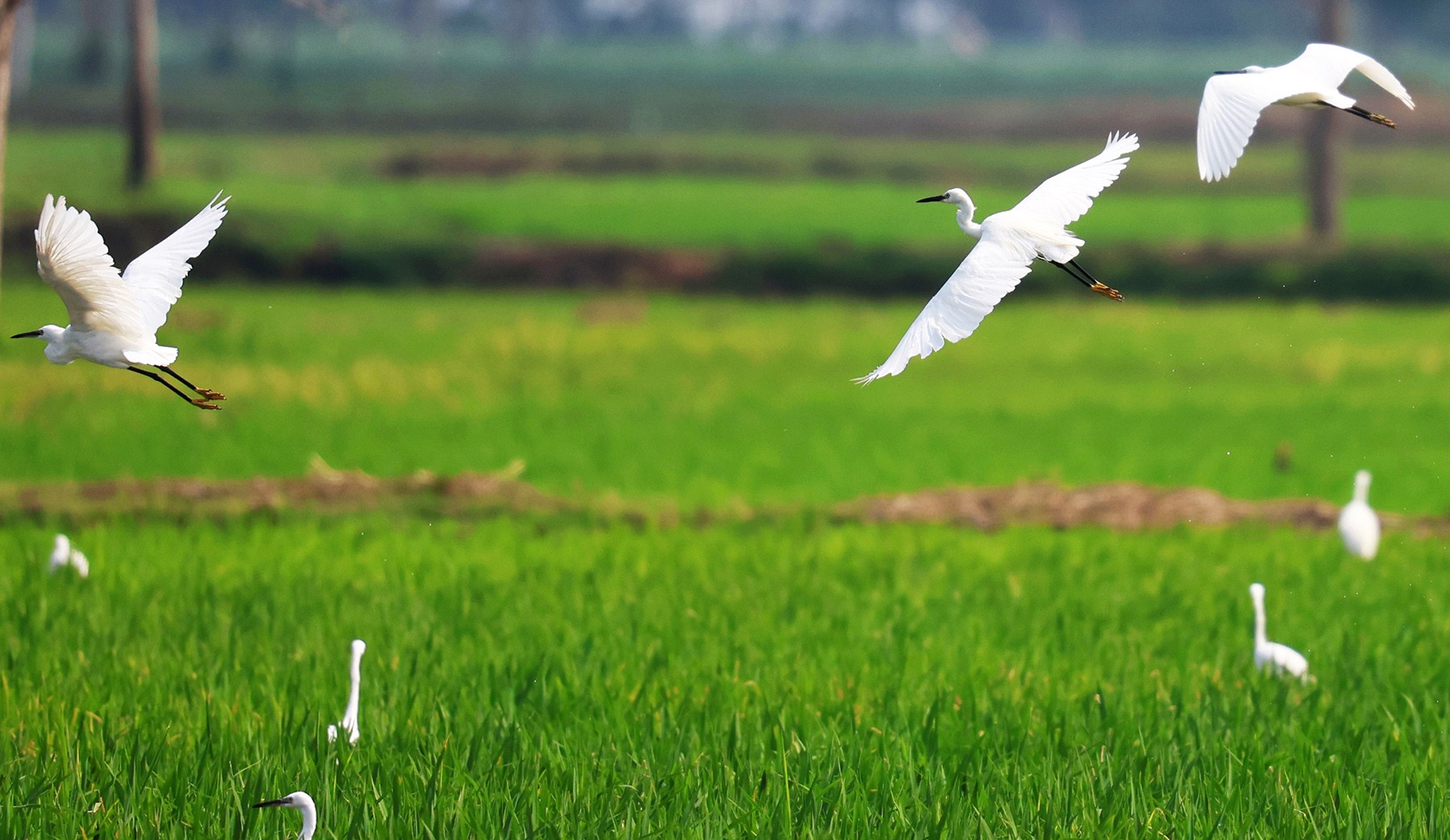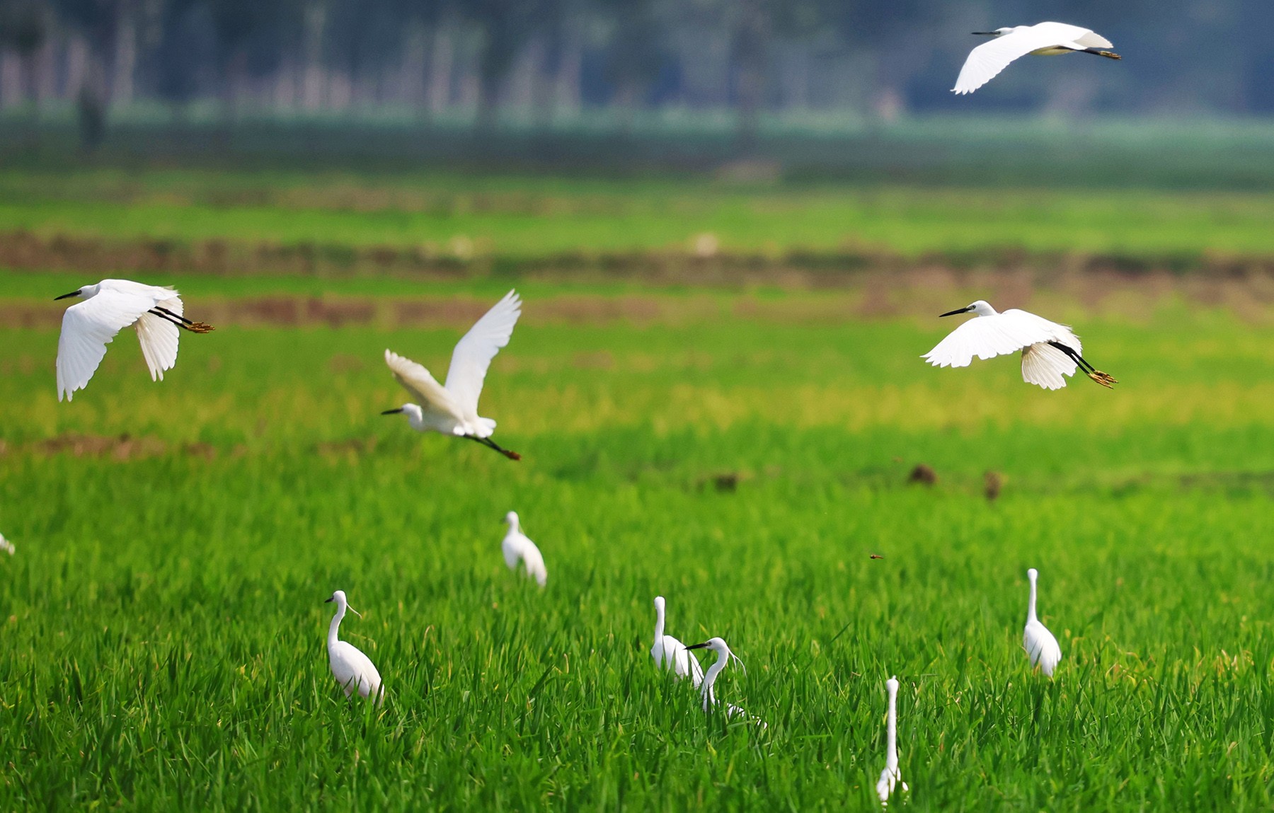 只见众多鹭鸟在山东省临沂市郯城县沂河畔水稻田间飞舞、休憩、觅食,构成一幅幅夏日生态田园美景。