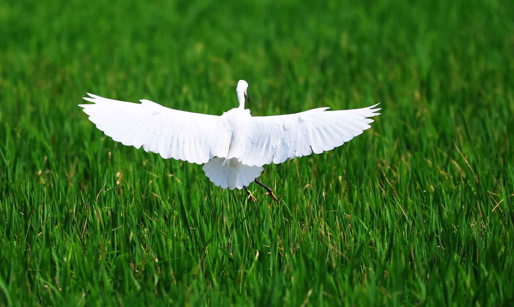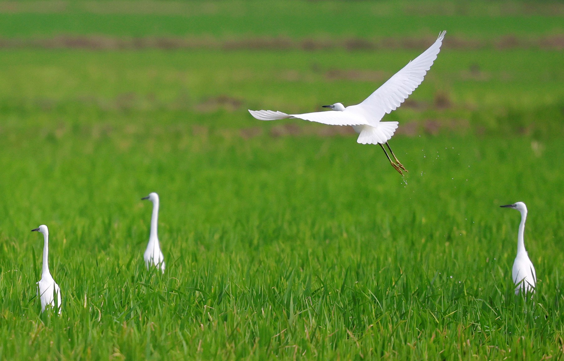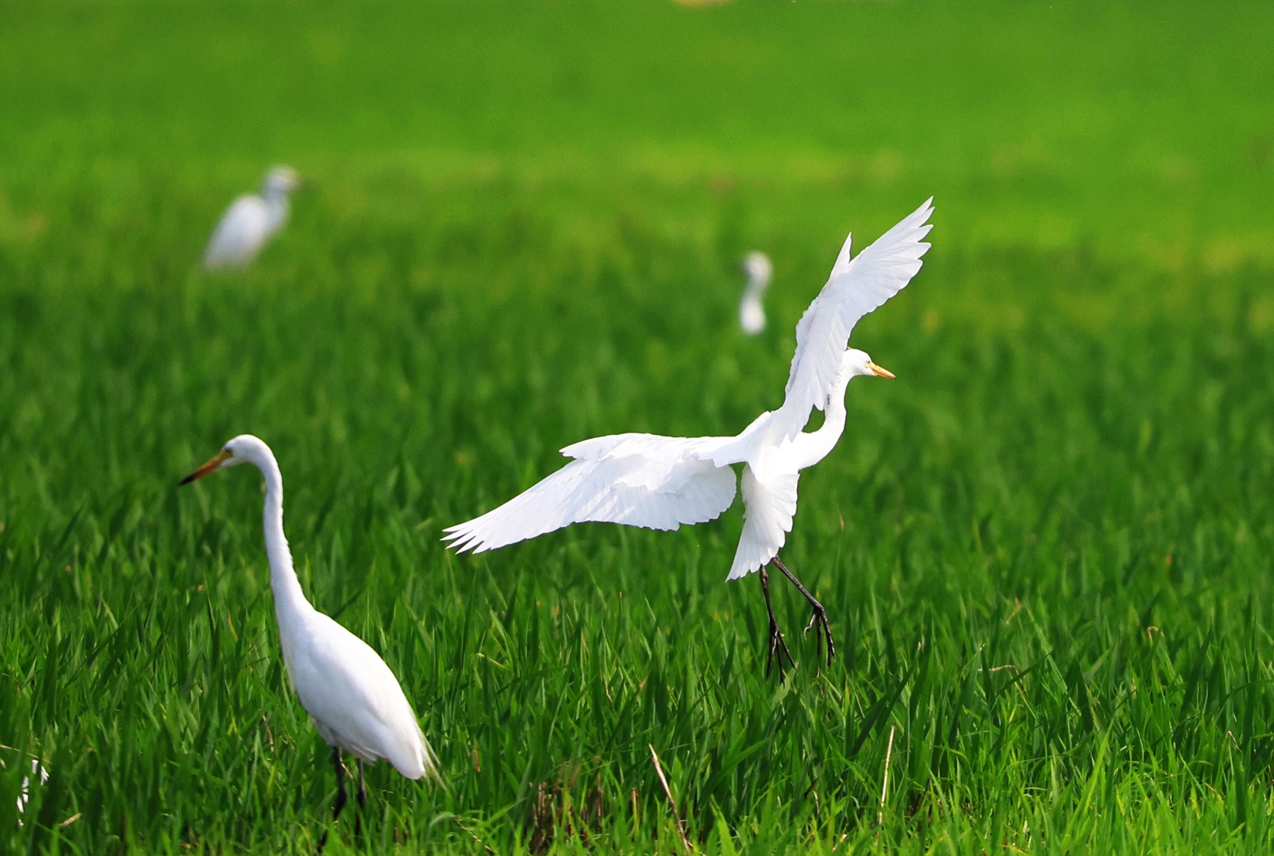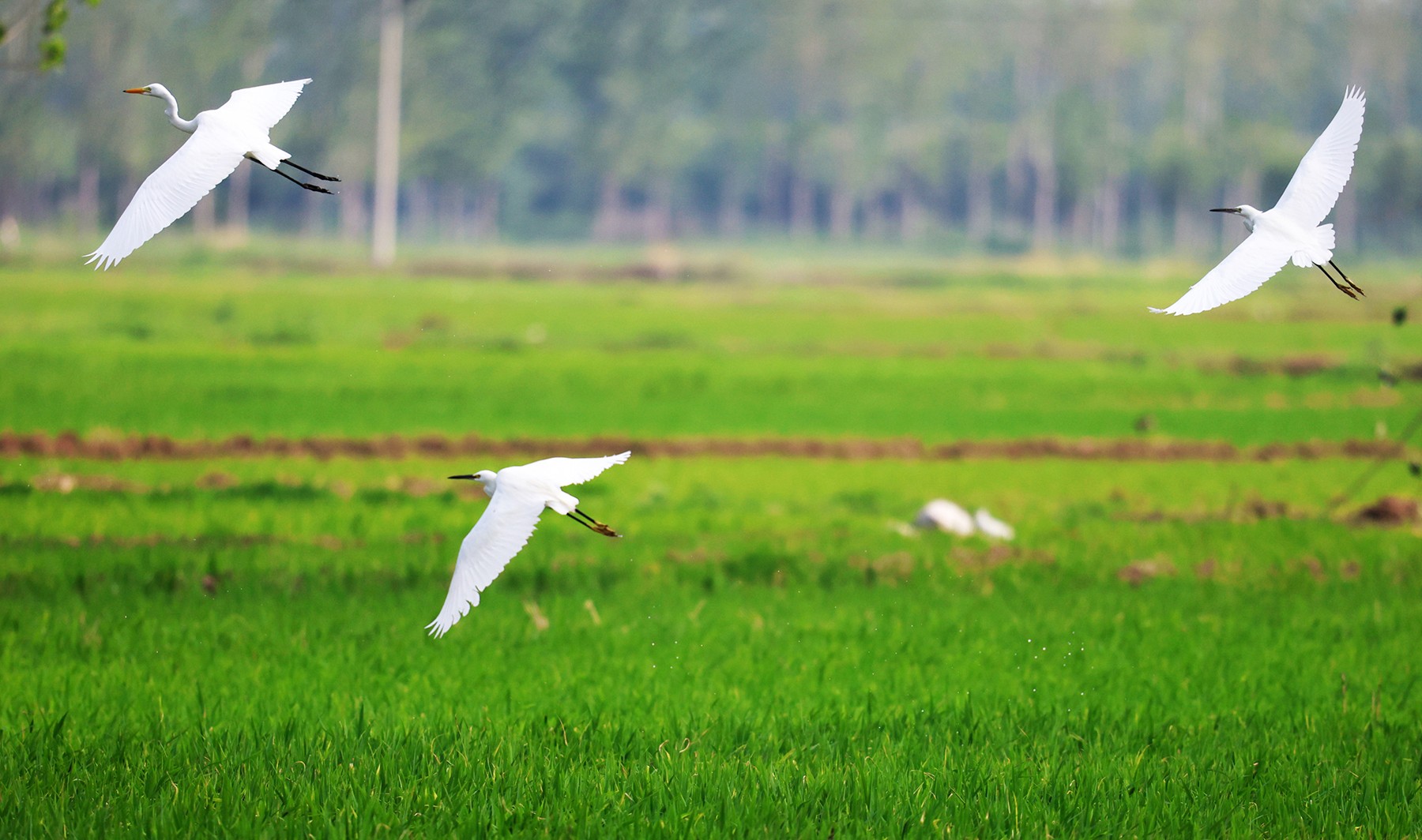 只见众多鹭鸟在山东省临沂市郯城县沂河畔水稻田间飞舞、休憩、觅食,构成一幅幅夏日生态田园美景。