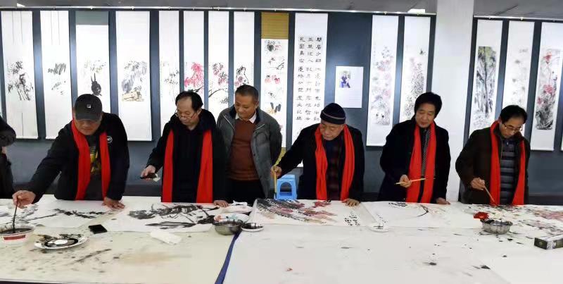 2021年12月31日,在山东省临沂市郯城县文体中心展览馆,书画家石启超、杜培明、顾伟、杨继贵、梁至淳(从左至右)在展览现场为观众创作书画