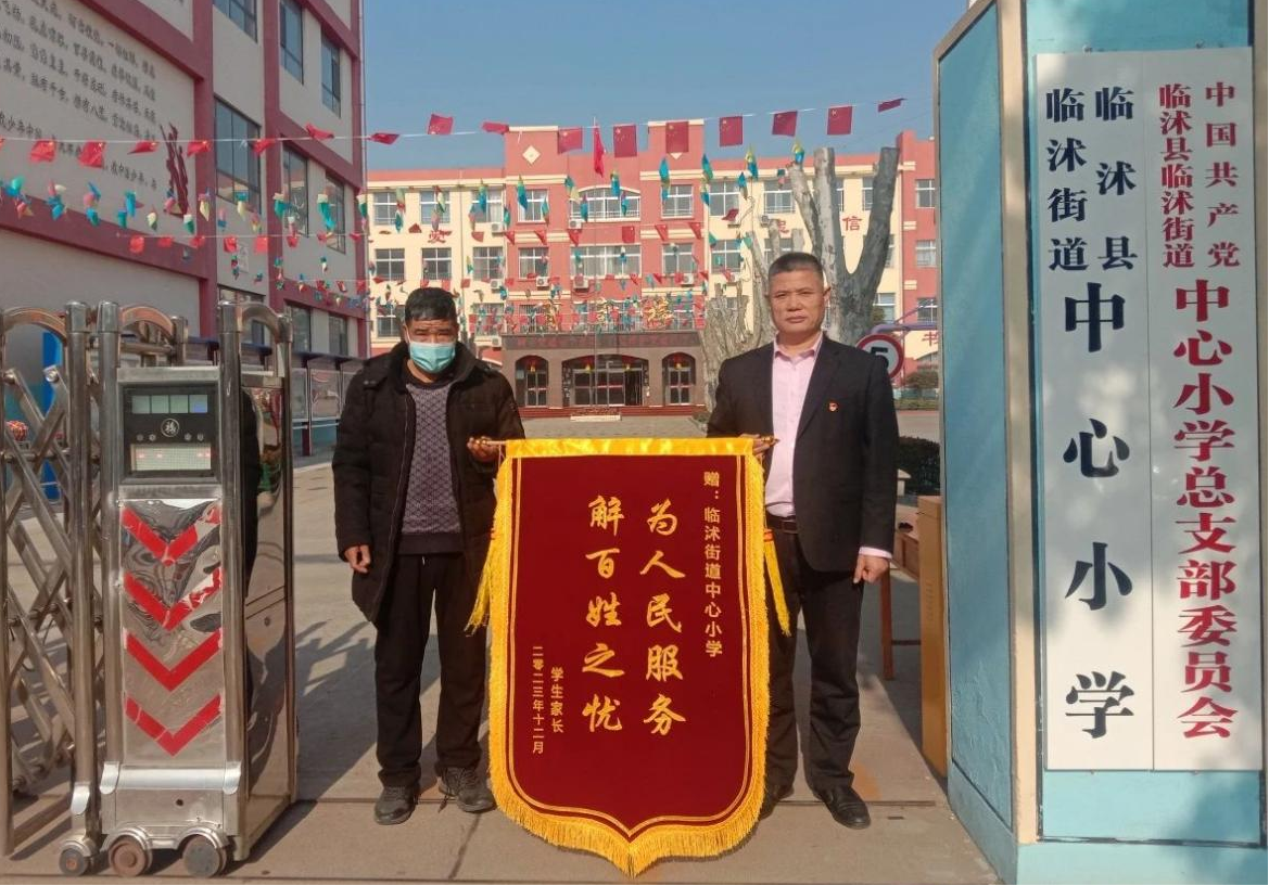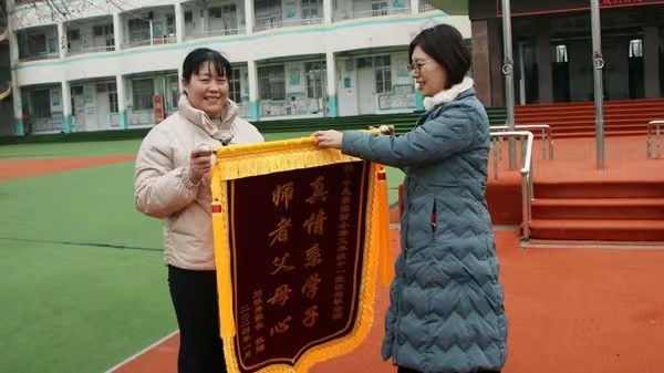 速豹新闻网 通讯员 刘祥1月18日,平邑县实验小学教育集团主校区三年级十一班刘依秀的家长手持绣有真情系学子 师者父母心的锦旗,表达对