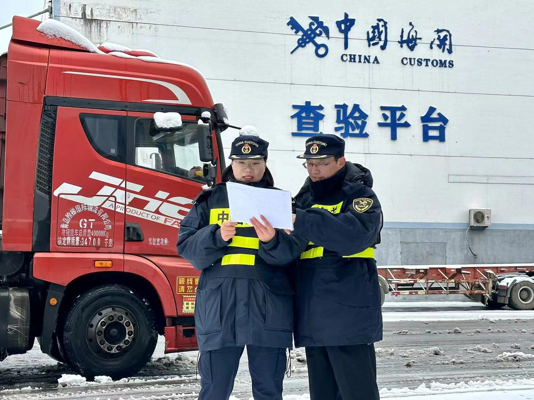 速豹新闻网 记者 于大龙 崔家浩1月16日,临沂迎来新年首场降雪。为降低风雪天气对通关的影响,临沂海关立即启动应急预案,合理调配人力