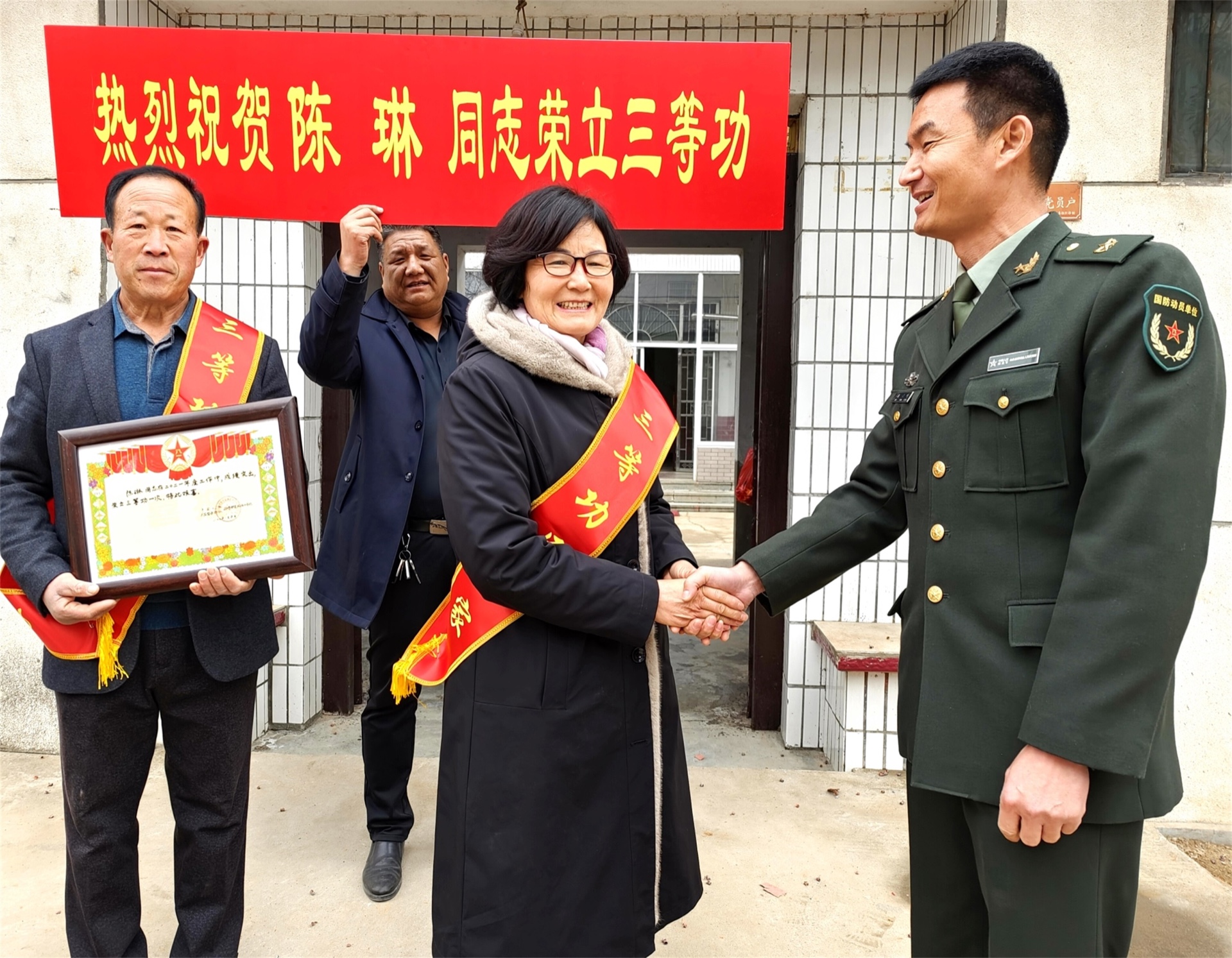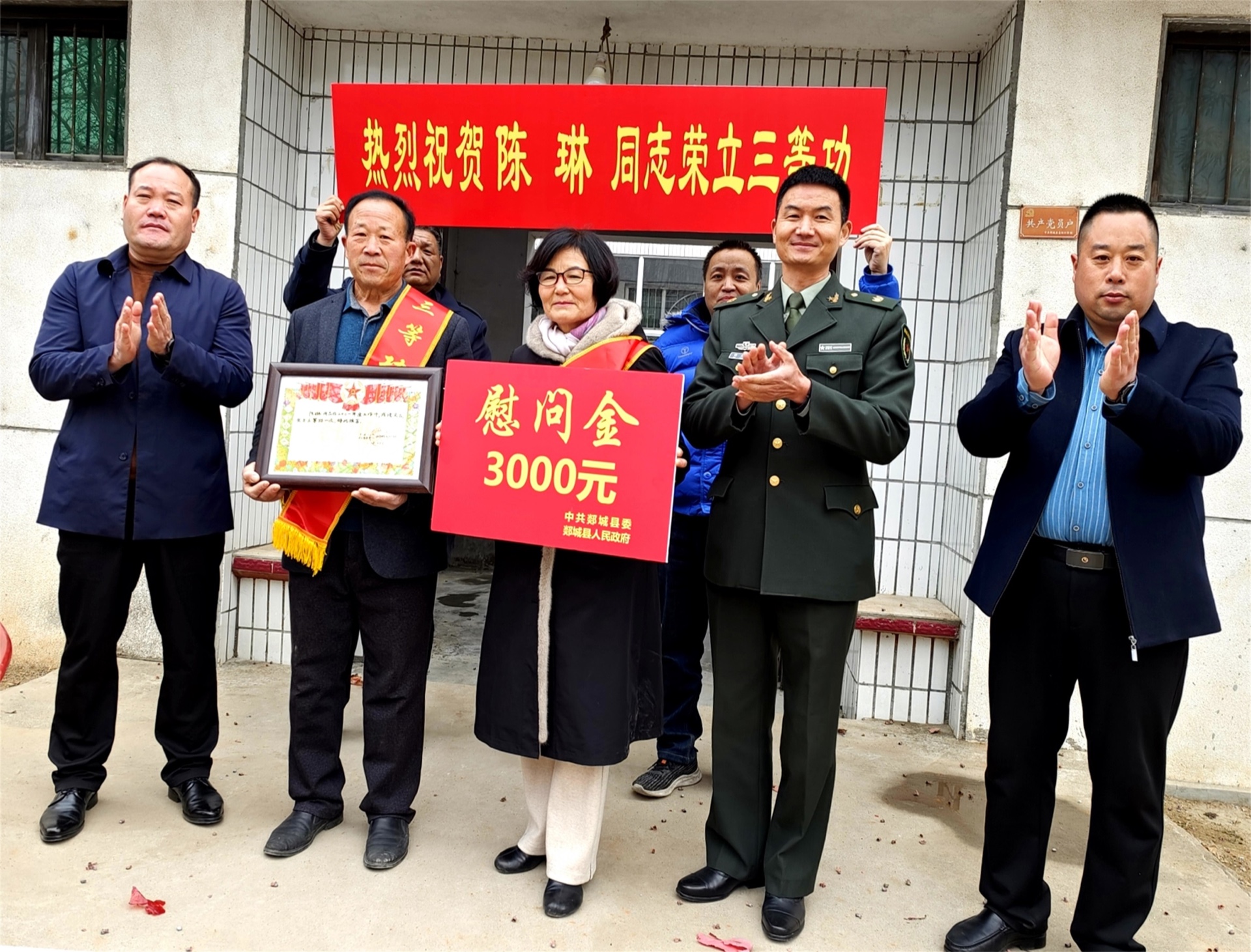 1月27日,郯城县马头镇房一村锣鼓喧天,鞭炮齐鸣,“热烈祝贺陈琳荣立三等功”的红色标语格外引入注目。郯城县人民武装部、双拥办和退役军人事务局工作人员带着慰问金和喜报,来到现役军人陈琳家中,走访慰问了“军人妈妈”黄洁。至此,郯城县265个军属家庭受奖。