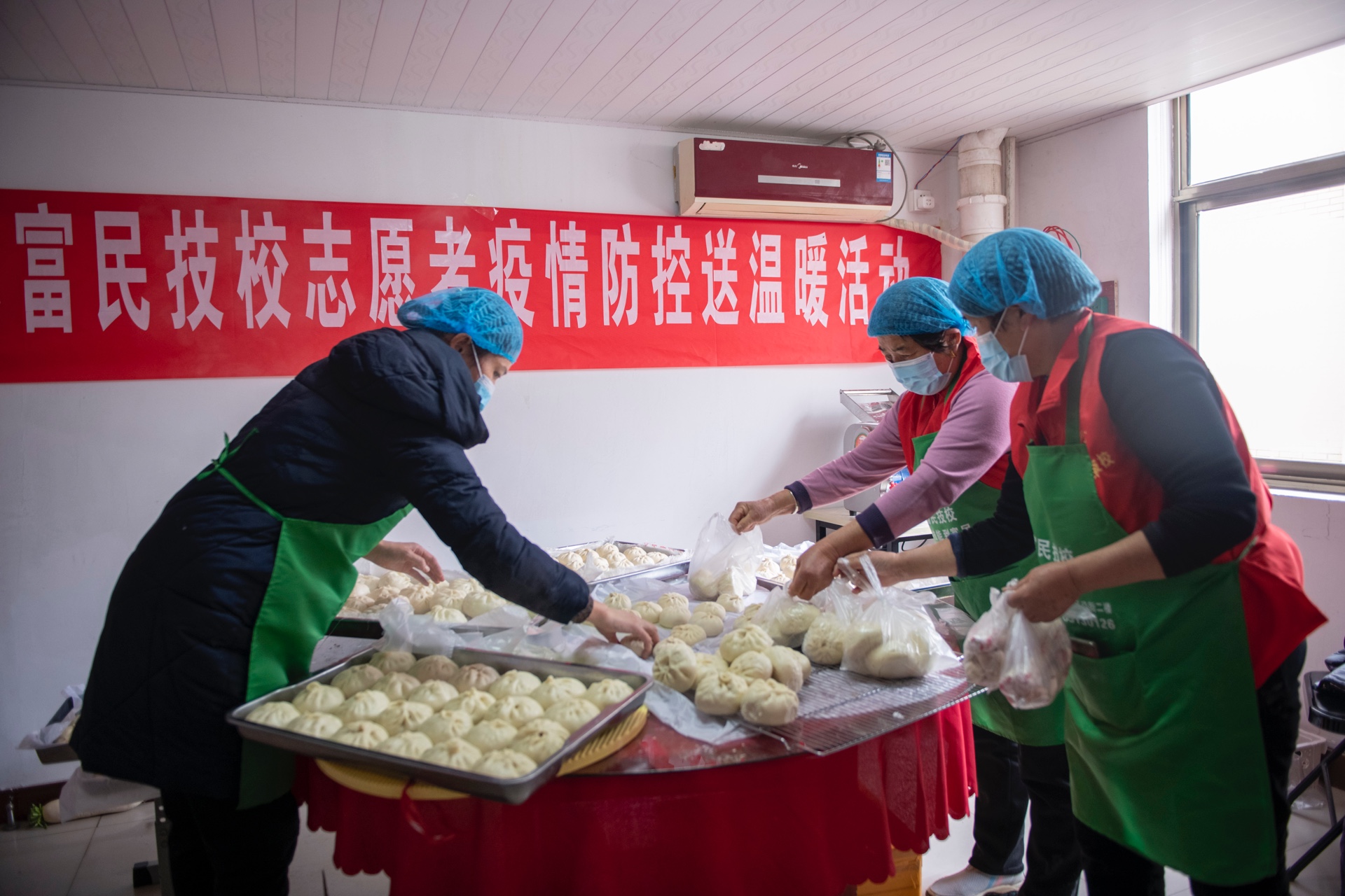 3月20日中午,临沭县富民技校负责人黄庆霞带领爱心志愿者,将刚出笼的3000多个包子和热乎乎的紫菜鸡蛋汤送到富民社区、怡安小区等全员核酸检测点,分发给在检测点执勤的工作人员和志愿者。