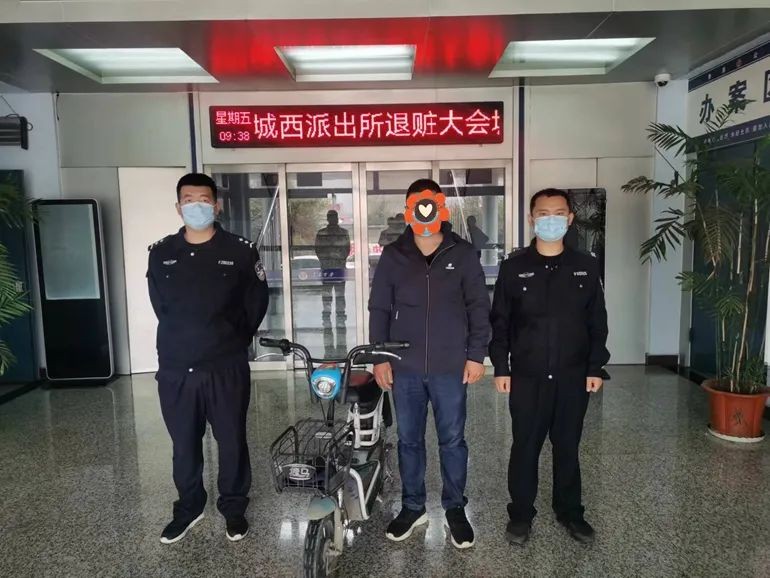 4月8日,城西派出所举行退赃活动,将破获的盗窃案件中追回的被盗车辆返还给受害人刘某。4月7日,刘某报警称其电动自行车被盗,城西派出所接报警后立即开展工作,于当日中午将被盗车辆追回,及时为群众挽回经济损失。