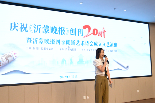 8月31日下午,《沂蒙晚报》创刊20周年暨沂蒙晚报四季朗诵艺术诗会成立活动成功举办,本次活动由临沂日报报业集团主办,沂蒙晚报社承办,夜郎古酒协办。本次活动还得到了汇缘商贸、高崖仙月、新材料产业园、商谷智慧产业园等企业的大力支持。