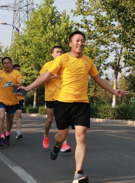 在观赛人员和志愿者们响亮的加油助威声中,身着临工黄比赛服的选手们仿佛一条奔腾的河流,跑过宽阔的临工路,沿着绿树成荫的解白河,绕过延安路,穿过装载机事业部,到达泰山石南侧的终点。