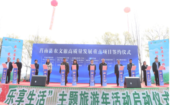 山东一杰文化传播有限公司与大店镇人民政府、临沂禛祺晴圆农业发展有限公司与大店镇人民政府、青岛佳垦集团与山东庄氏农业科技有限公司、莒南县华元牧业有限公司与板泉镇人民政府、莒南县辉煌航天科技有限公司与板泉镇人民政府、北京京润山水旅游开发有限公司与坊前镇人民政府进行签约。